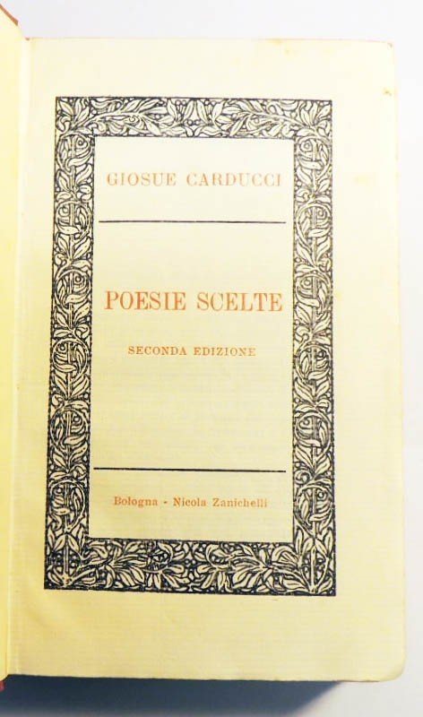 Giosue Carducci, Poesie scelte, Nicola Zanichelli, Bologna 1922, seconda ed., pp. 417, 1 c. di tav. con ritratto b.n. e velina in antiporta, cm 14, tela ed. con titoli e fregi in oro al dorso e decorazione in oro al piatto. Lievissime tracce d’uso alla legatura, uno strappo senza mancanze ad una carta, fioriture ai tagli, per il resto esemplare ben conservato.