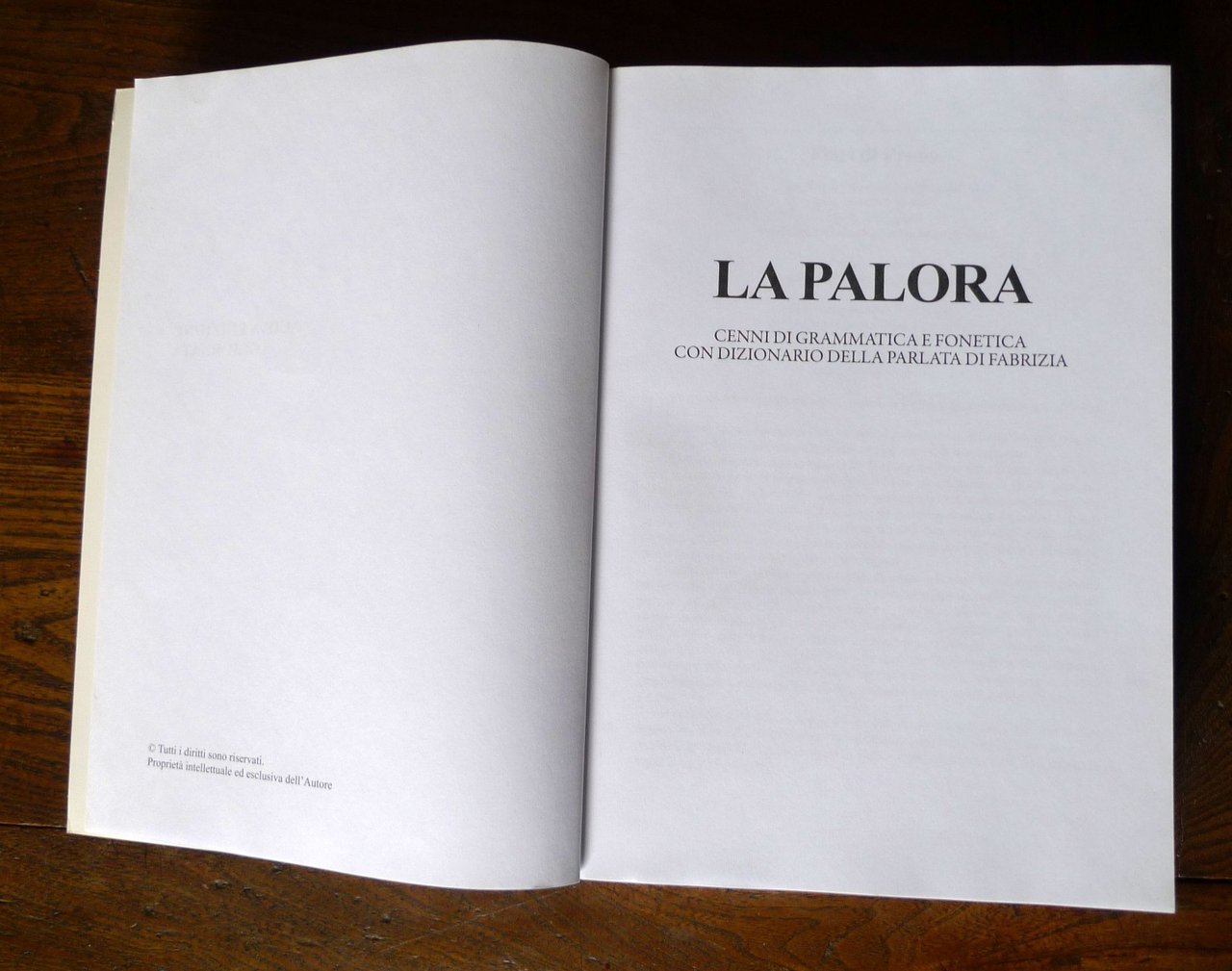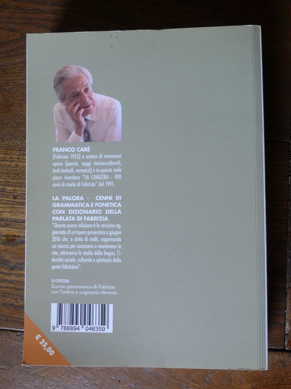 Franco Carè,LA PALORA.CENNI DI GRAMMATICA E FONETICA.CON DIZIONARIO DELLA PARLATA FABRIZIA.Stampa: Più Comunicazione. Caserta 2017,nuova edizione aggiornata,brossura, 24x17 cm., pp.480,testi in italiano e in dialetto di Fabrizia,ISBN:9788894046359,peso: kg.1,1cod.9558CONDIZIONI DEL LIBRO: come nuovo