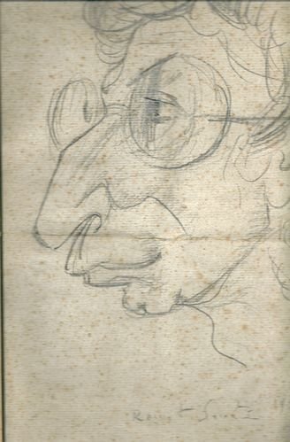 Caricatura a lapis. Foglio in carta povera di cm. 34x22. Marcata caricatura di personaggio da identificare, firma e data autografa dell'artista alla base. Piccole fioriture diffuse.