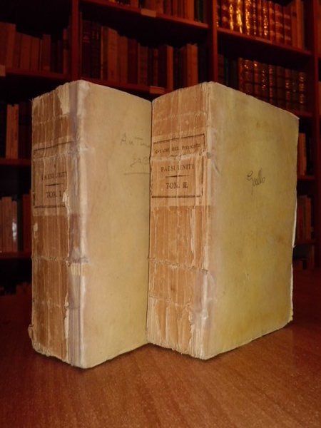 (Piemonte) - (Gallo, Conte). Torino, a spese di Onorato Desideri, 1798. Cariche del Piemonte e Paesi uniti colla serie cronologica delle persone che le hanno occupate ed altre notizie di nuda istoria dal fine del secolo decimo sino al dicembre 1798 con qualche aggiunta anche del tempo posteriore. Tomo I (e II). 2 volumi in - 8°, br., cop. orig. muta con tasselli (dorsi logori). (4), viv, 762, 22, 10 pp.; 710, 50, 17, (3) pp. Soltanto i primi due volumi (di tre), di questa rara ed interessante opera storica molto dettagliata. Melzi, Opere anonime, I, p. 175. Lozzi, 3605 (in nota: << Raro >>. Manca alla Bibl. Platneriana. Uff. Mob. 3