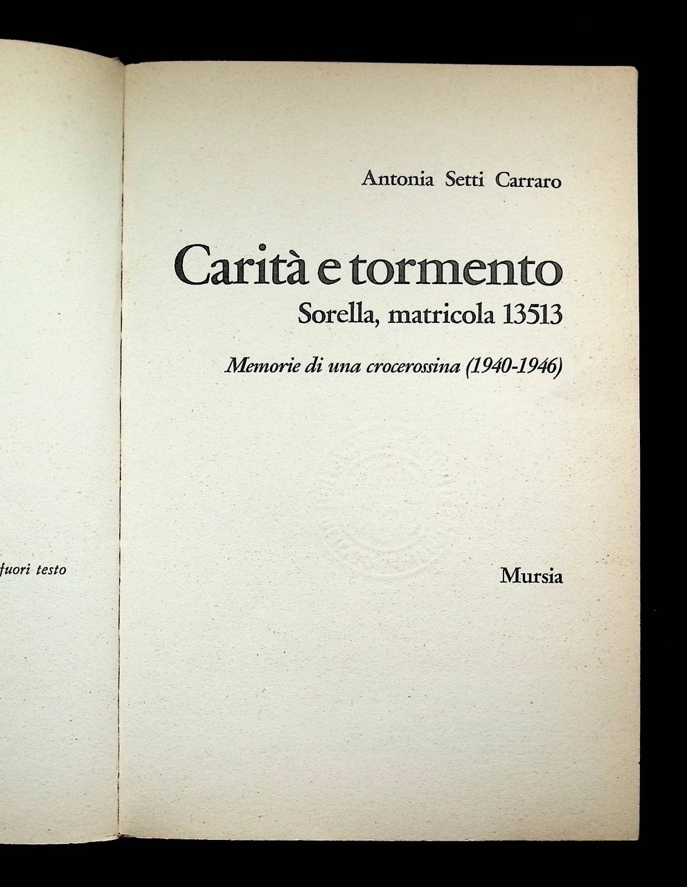 Carità e Tormento Libro Setti Carraro Memorie Di Una Crocerossina Mursia 1982