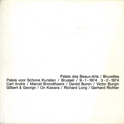 Exhibition catalogue published in conjunction with show held at the Palais des Beaux-Arts, Brussels, Belgium, September 1 - October 2, 1974. Preface by Yves Gevaert. Artists include Carl Andre, Marcel Broodthaers, Daniel Buren, Victor Burgin, Gilbert & George, On Kawara, Richard Long, and Gerhard Richter. Illustrated in black-and-white and color. Includes artists' biographies. — F.to: 20x20; pagg. 80; COL e BN; rileg. brossura. Editore: Palais des Beaux-Arts, Bruxelles, 1974.
