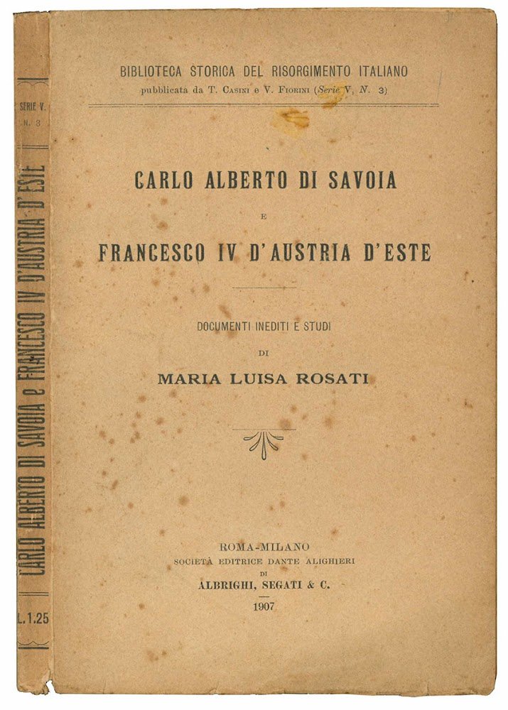 Mm. 195x125, Pp. 128. Carta uniformemente brunita. Brossura editoriale con titolo al dorso e alla copertina anteriore. Fioriture ed aloni alle copertine e alle prime e ultime carte. Minime mancanze alla cuffia inferiore. Fogli in parte ancora chiusi. Il volume appartiene alla collezione "Biblioteca storica del risorgimento italiano" pubblicata da T. Casini e V. Fiorini. Serie V, n. 3.