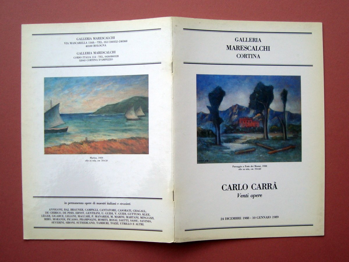 Catalogo, Galleria Marescalchi Cortina CARLO CARRA' Venti Opere Marescalchi, Cortina; 1989; cm 30,5x21; pp. n.n. sciolte; br. ed. con ill. fot. a colori p.p. Condizioni di conservazione Esemplare in buone condizioni con tracce del tempo; bruniture ai margini OPEB.5864 blu