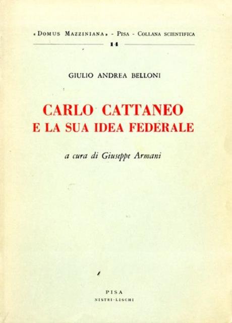 157 p. ; 21 x 16 cm. Collana scientifica, 14 / Domus Mazziniana. Il saggio su «Carlo Cattaneo e la sua idea federale». composto da Giulio Andrea Belloni nel 1944 e rimasto a lungo inedito nell'Archivio della Domus Mazziniana, è suddiviso in due parti, la prima delle quali espone le vicende della vita di Cattaneo e nei illustra i momenti salienti con citazioni delle opere e dall'epistolario, mentre la seconda riconduce i tratti del suo pensiero al federalismo, che ne è stato il fulcro non soltanto politico, offrendo una interpretazione unitaria di scritti che giudizi poco avvertiti hanno a torto talora voluto considerare disorganici e poco assimilabili. Brossura editoriale, coperta in cartoncino flessibile con titoli al piatto e al dorso. Codice libreria 8377.
