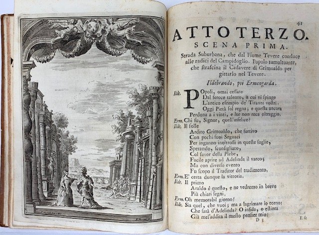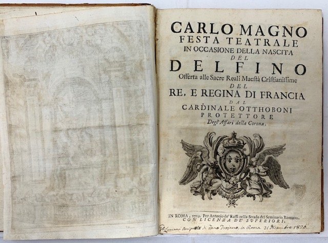 >in-4, pp. (22), 64, leg. del tempo m. pelle con tit. e fregi oro al dorso, tagli marmorizz. Il testo è preceduto da una ''Notizia storica'' in italiano e francese. Dedicato ''alle Sacre Reali Maestà Cristianissime del Re, e Regina di Francia dal Cardinale Otthoboni, protettore degl'affari della Corona''. Antiporta raffig. il proscenio del teatro, Armi di Francia inc. sul tit. e 13 magnifiche tavole f.t. illustranti le diverse scene della festa, disegnate da Nicolò Michetti, impresario del Card. Ottoboni, e finem. inc. in rame da Filippo Vasconi, Carlo Grandi, Paolo Pilaja e G. Massi. Di particolare importanza è l'antiporta, che costituisce una delle prime raffigurazioni di un'orchestra barocca, formata da 11 elementi e diretta dal Costanzi. Prima edizione (una tiratura in-folio di 100 esempl., nella quale le tavole sono comprese entro bordure barocche, venne destinata alla corte di Francia) di questo libretto d'opera in tre atti in versi, scritto dal Cardinale Pietro Ottoboni, nipote di Papa Alessandro VIII, per celebrare la nascita del Delfino di Francia, Luigi (1729-65), unico figlio di Luigi XV e di Maria Leckzinska e futuro padre di Luigi XVI; la musica venne composta da Giovanni Costanzi (noto come Giovannino del Violoncello, Roma 1704-1778, grande compositore ed innovatore nella tecnica del violoncello), allora al servizio dell'Ottoboni e Maestro di Cappella in S. Luigi dei Francesi. Animarono la festa, che ebbe luogo in Piazza Navona, sontuosi fuochi d'artificio, ideati da Pierleone Ghezzi su incarico del Cardinale Melchior de Polignac, ambasciatore di Francia a Roma, il quale donò al Ghezzi un diamante del valore di oltre 200 doppie. Bell'esemplare, puro e marginoso, di questo libro di feste raro e di notevole pregio, con antica nota di possesso ms. nel margine infer. del frontesp. (piccole macchie d'inchiostro nell'angolo alto delle pp. 33-34. “Le illustrazioni costituiscono un documento prezioso per la storia del teatro... l’antiporta rappresenta l’unica raffigurazione conosciuta, all’infuori dei disegni di Juvarra, del teatro della Cancelleria” (Olivier MICHEL). Esposito, Annnali di A. de Rossi, 449-50. Sonneck, Cat. of Opera Librettos I, 259. Allacci 166. Sartori 5108. Notizie su Costanzi in Diz. Biogr. It., vol. 30, pp. 380-3.