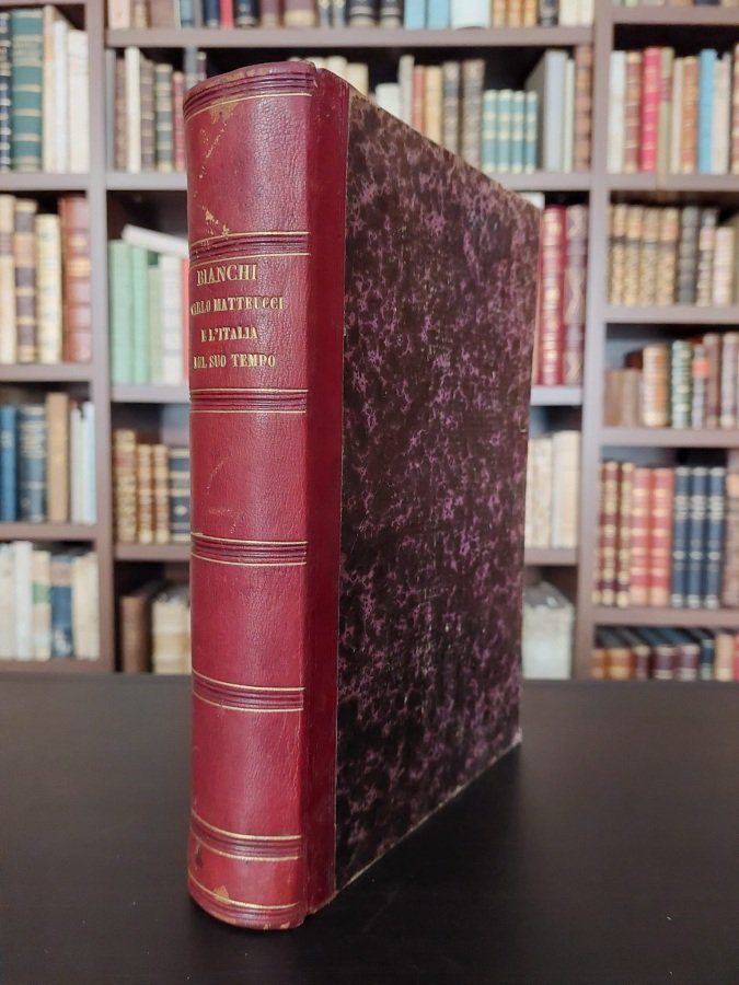 In-8° (cm. 23,6), legatura coeva in mezza pelle rossa, titolo in oro al dorso tra filetti sempre in oro e altri a secco (lievi tracce d'uso, minime abrasioni ai piatti); pp. XI [1b] 595 [1b] in stato molto buono (lievi e sporadiche fioriture); con 1 ritratto fotografico del Matteucci all'antiporta fuori testo. Prima edizione di questa biografia del grande scienziato e statista forlivese, <span style="font-size: 13.333333px;">corredata di un'ampia appendice bibliografica. Esemplare molto buono. (ND4)</span>
