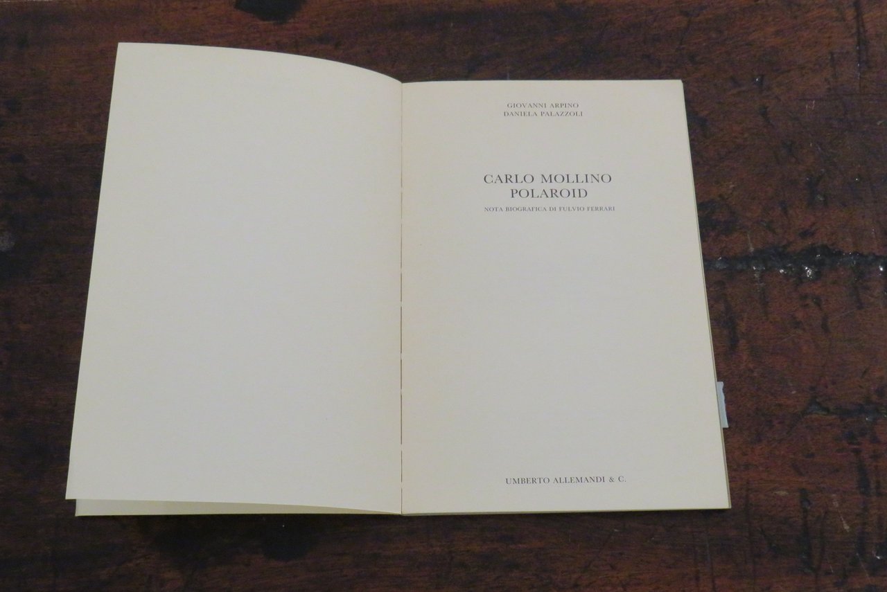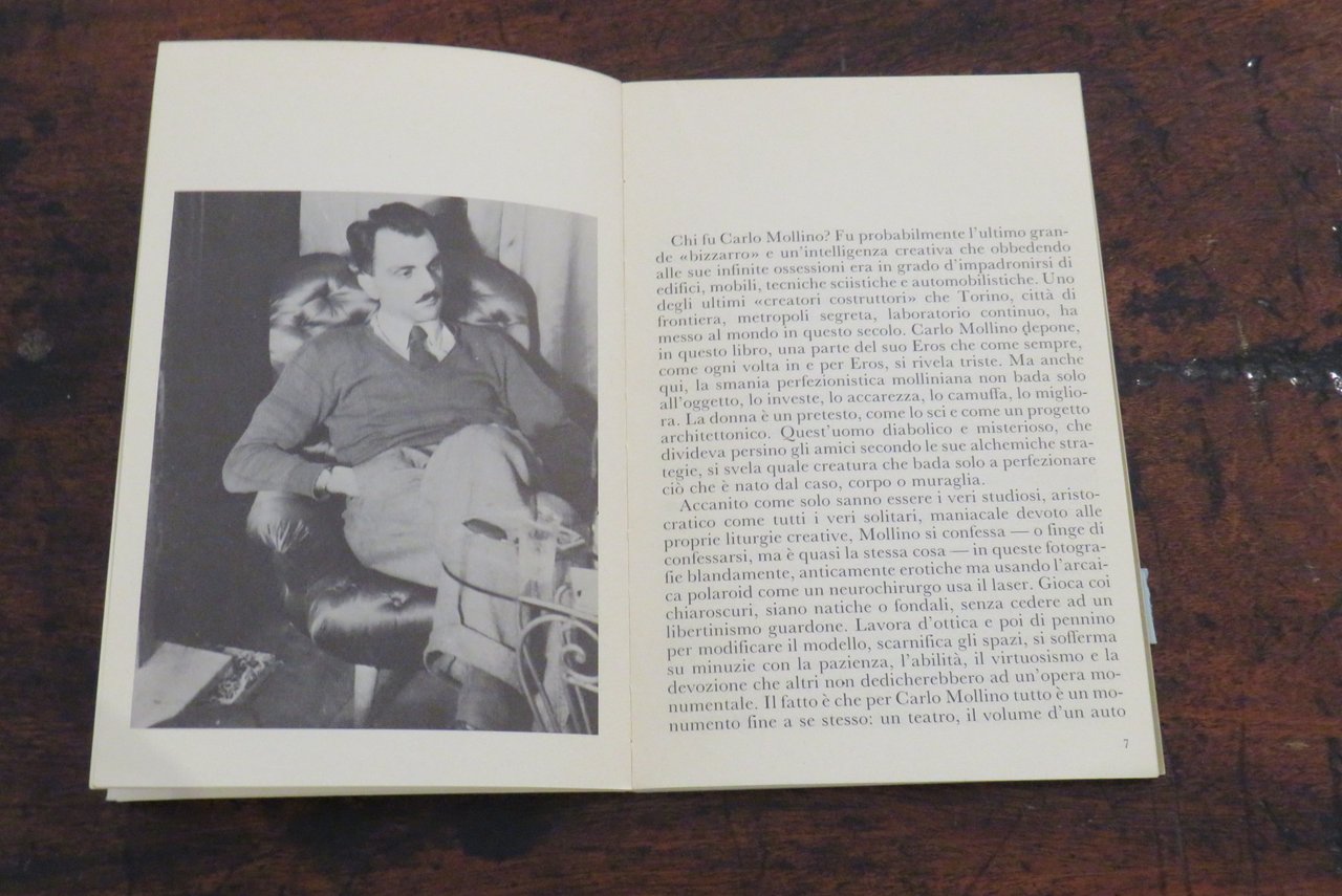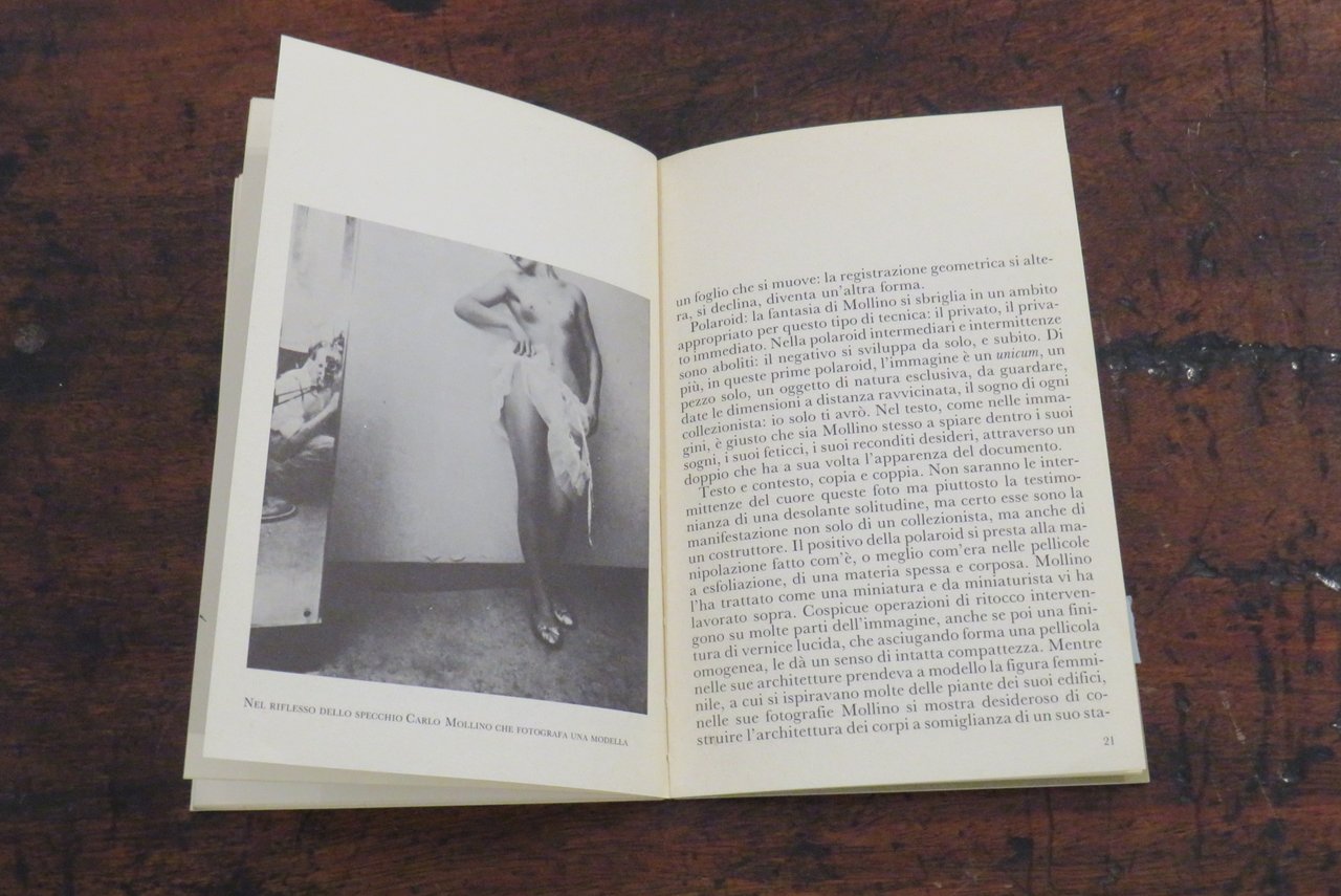 Torino, Umberto Allemandi & C., 1985. In -16 (mm. 130,5x200,5), pp. 30, con illustrazioni in nero nel testo e 8 tavole, riproduzioni fotografiche originali a colori, fuori testo, stampate recto-verso su carta patinata, di Carlo Mollino. Brossura editoriale illustrata a colori al piatto anteriore, con titoli al dorso. Testi di Giovanni Arpino ("L’ultimo grande bizzarro"), di Daniela Palazzoli ("Il messaggio della camera oscura"). Nota biografica di Fulvio Ferrari ("Cronaca"). Collana GALLERIA I libri delle mostre N. 5. Catalogo dedicato alle polaroid erotiche, scattate dal poliedrico architetto torinese. "Questo volume è stato pubblicato in coincidenza con la prima mostra delle fotografie originali qui riprodotte di Carlo Mollino. Allestita nella Galleria Fulvio Ferrari di Torino ottobre-dicembre 1985. Fotografie originali: Collezione Fulvio Ferrari". Conservata la rara fascetta editoriale originale ("L’occhio privato di un grande eccentrico"). Prima edizione. Il dorso appare lievemente allentato, ma nel complesso ottimo.