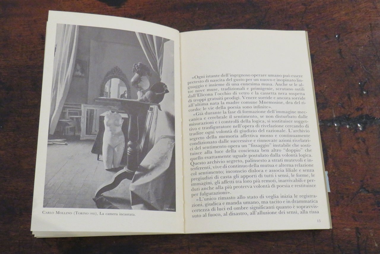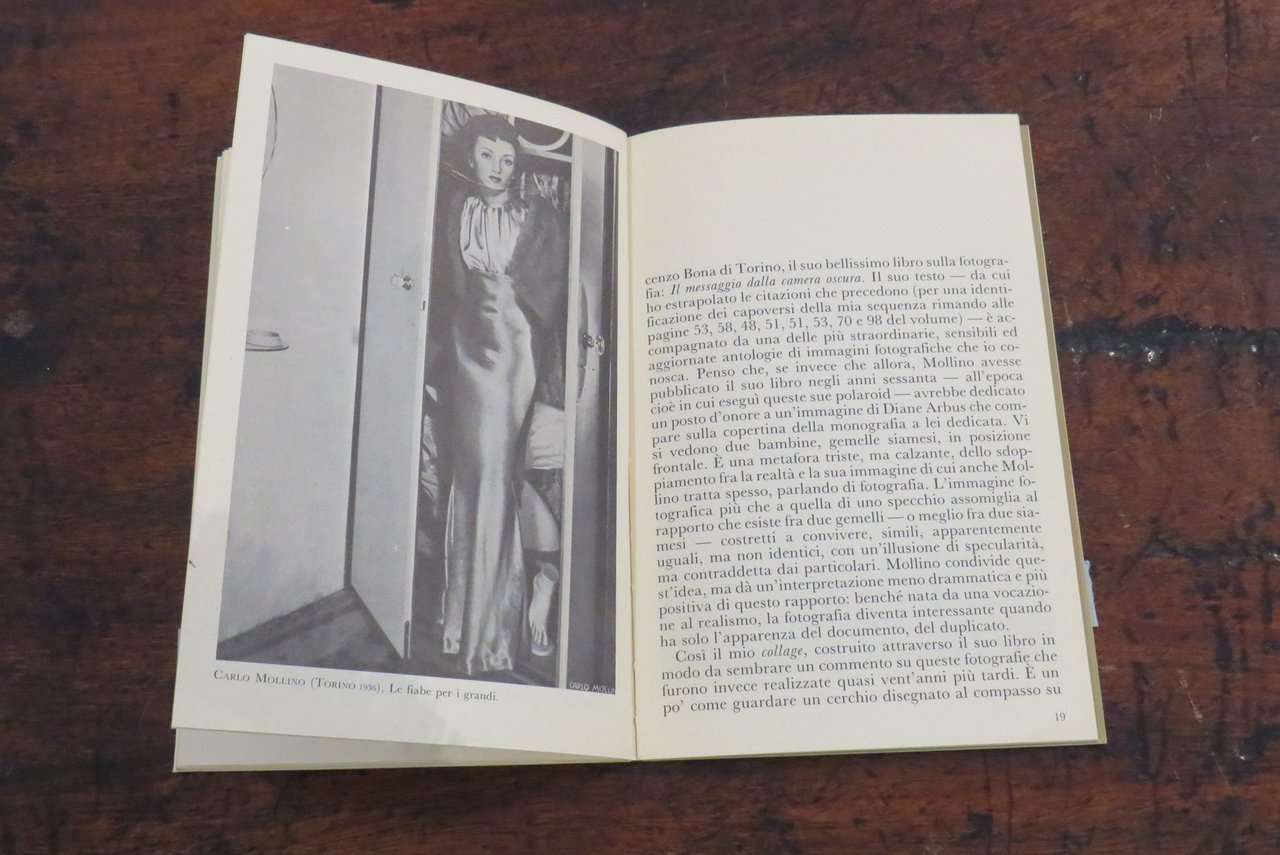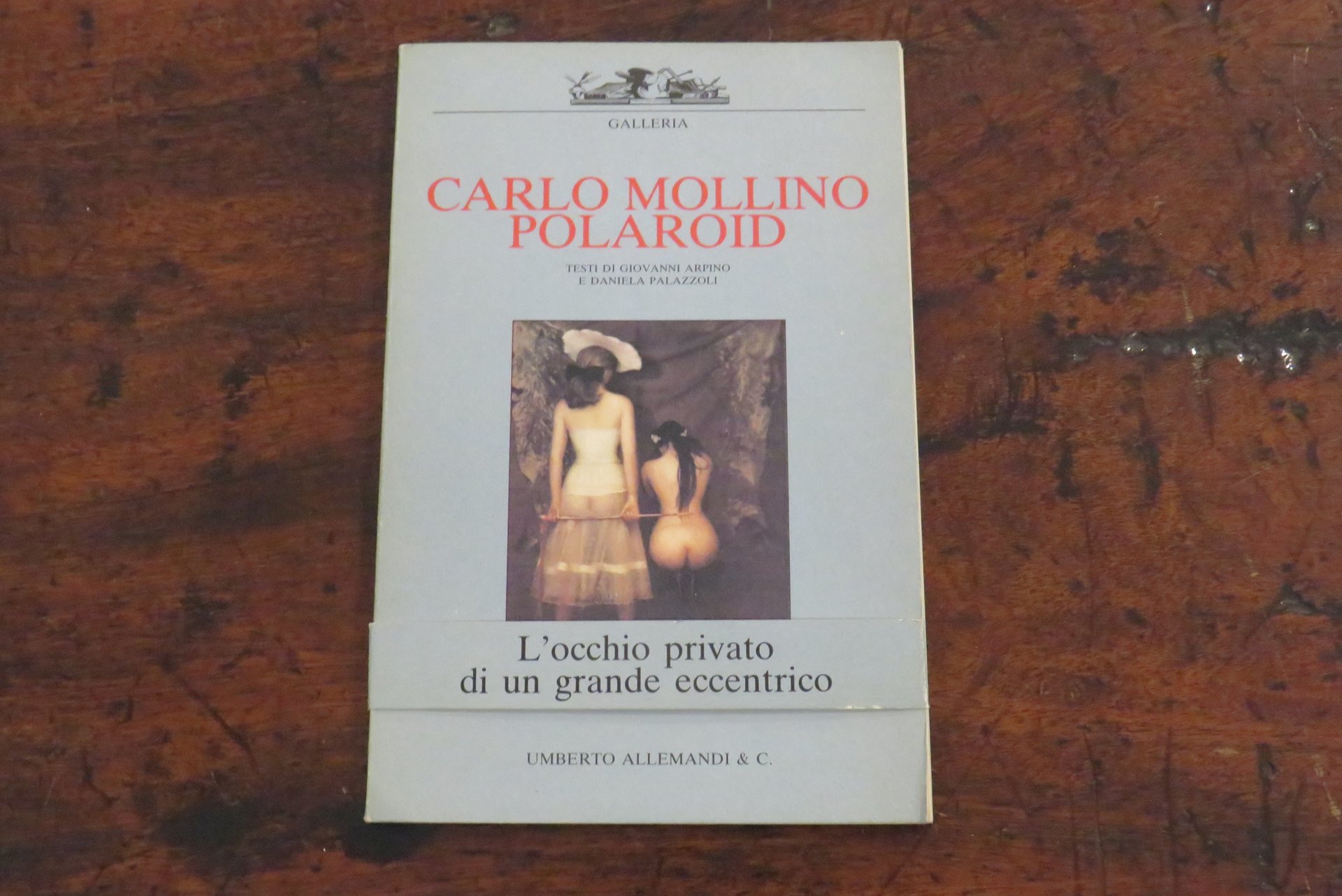 Torino, Umberto Allemandi & C., 1985. In -16 (mm. 130,5x200,5), pp. 30, con illustrazioni in nero nel testo e 8 tavole, riproduzioni fotografiche originali a colori, fuori testo, stampate recto-verso su carta patinata, di Carlo Mollino. Brossura editoriale illustrata a colori al piatto anteriore, con titoli al dorso. Testi di Giovanni Arpino ("L’ultimo grande bizzarro"), di Daniela Palazzoli ("Il messaggio della camera oscura"). Nota biografica di Fulvio Ferrari ("Cronaca"). Collana GALLERIA I libri delle mostre N. 5. Catalogo dedicato alle polaroid erotiche, scattate dal poliedrico architetto torinese. "Questo volume è stato pubblicato in coincidenza con la prima mostra delle fotografie originali qui riprodotte di Carlo Mollino. Allestita nella Galleria Fulvio Ferrari di Torino ottobre-dicembre 1985. Fotografie originali: Collezione Fulvio Ferrari". Conservata la rara fascetta editoriale originale ("L’occhio privato di un grande eccentrico"). Prima edizione. Il dorso appare lievemente allentato, ma nel complesso ottimo.