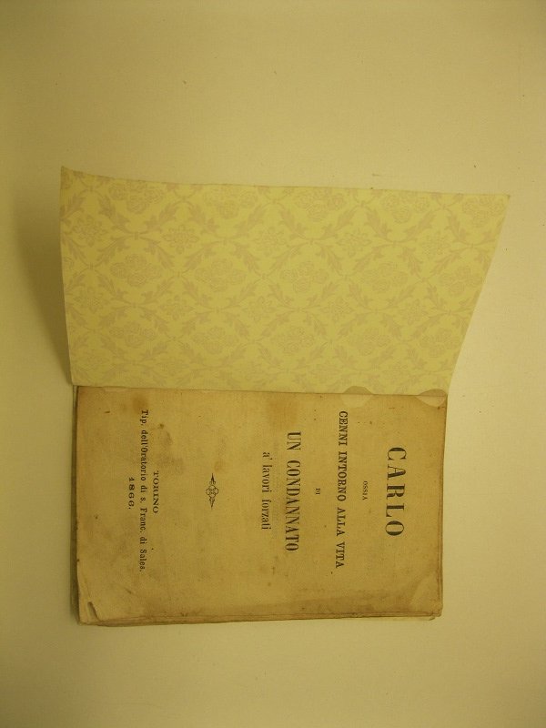 In 24, pp. 63. Br. rifatta (conservato p. post.). Storia di Carlo G., figlio di notaio stimato, condannato ai lavori forzati a Cayenna per false scritture. In appendice e' raccontata la storia di un giovane di mente ottusa che acquisto' ingegno attraverso la lettura del santo rosario.