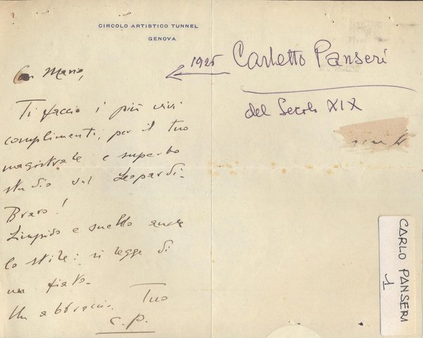 Carlo Panseri. ingegnere, studioso della metallurgia e scrittore di numerosi manuali tecnici. Lettera manoscritta e firmata.