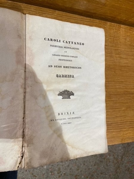 libretto discretamente ben conservato - pagine ingiallie dal tempo ma leggibili e sfogliabili - presente solo la parte frontale della copertina ma staccata- scritto in latino : carli cattaneo presbyteri mediolanensis in caesareo brixiensi gymnasio professoris ad suos rhetoricos carmina