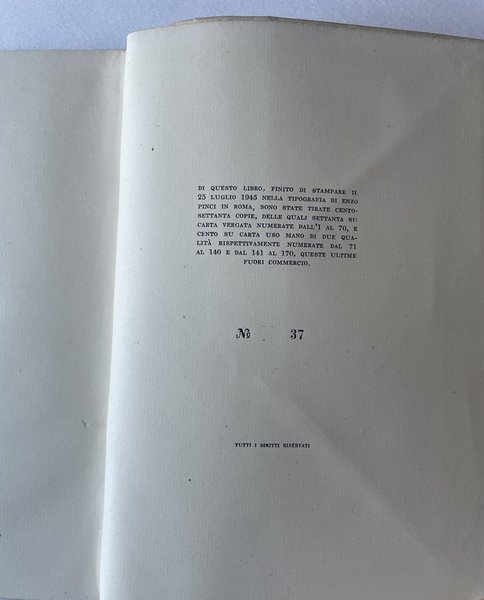 Prima edizione. Edizione in tiratura limitata di 170 copie delle quali settanta su carta vergata numerate dall’1 al 70, e 100 su carta uso mano, il presente è il n. 37