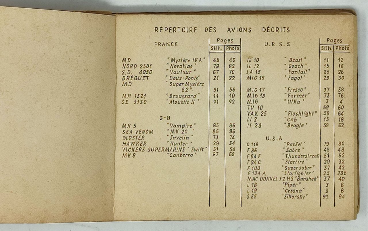 Formato: 14,5 x 10,5 cm circa. Stato di conservazione: evidenti segni del tempo e dell'utilizzo sulla copertina anteriore (superficiali abrasioni, un piccolo strappetto senza mancanza, pieghe e qualche piccolo alone), tracce di ruggine (causate dalla rilegatura metallica) sul retro delle due copertine, un' 'orecchia' sull'angolo inferiore del frontespizio, 'orecchia' sull'angolo inferiore dei due fogli che cintengono le pagine 16-18, tale piega, sul foglio che cntiene pagina 17 e 18 ha causato delle piccole rotture ma, nel complesso, un esemplare più che discreto. Privo di scritte o segni nel testo. Carnet illustrato. Ogni pagina è dedicata ad un aereo diverso e presenta l'illustrazione in nero del modello con brevi didascalie che ne descrivono le componenti principali. Tra i vari modelli presenti: PIPER L-18, CESSNA L-19, MIG 17 fresco, MD F2 H3 Banshee, MIG-15 fagot, LOCKHEED STARFIGHTER F 104 A, IL-12, SUPER MYSTERE B2 CHASSEUR, THUNDERSTREAK F.84 CHASSEUR, F-86 'SABRE', MYSTERE IV A, SUPER - SABRE (F 100), F - 94 - C STARFIRE. L'ultima sezione è dedicata agli elicotteri.