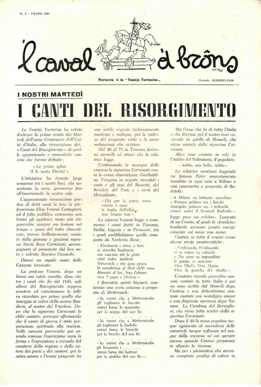 Fascicolo cm. 30 x 20,5, pp. (64). Brossura editoriale spillata. Con il n. 2 di 'l caval 'd brons. Fevrè 1961. Pp. (4).