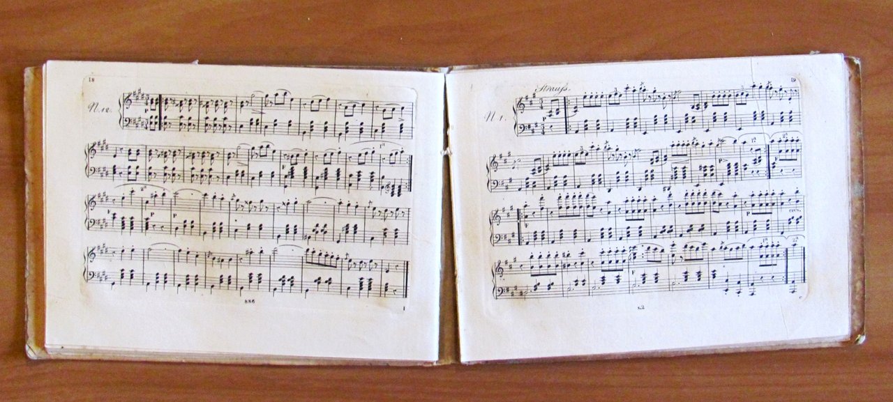 Pentagrammi con impressioni di stampa a secco  di: Waltz e Lanner 12 Valzer del M. Pietro Marini; Straufs; Gran Galop di Herz. Ed. Francesco Lucca - Milano, Anno 8° s.d. primi '800. Cartonato editoriale con  lievi tracce di vecchie gore alla copertina, ma interno ottimo. 20x44; pp.50. BUONISSIMO STATO , Molto buono (Very Good)
