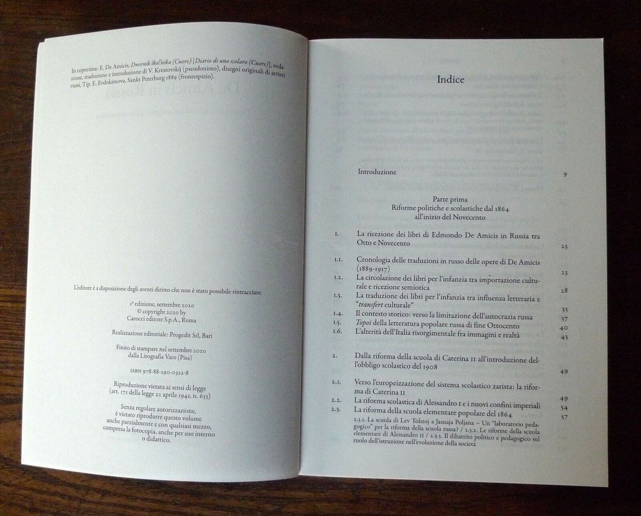 Dorena Caroli,DE AMICIS IN RUSSIA.La ricezione nel sistema scolasticozarista e sovietico.Carocci editore, Roma 2020,prima edizione: settembre 2020,brossura, 22x15 cm., pp.223,BIBLIOTECA DI TESTI E STUDI / 1334SCIENZE DELL'EDUCAZIONE.ISBN: 978-88290-0322-8,peso: g.400
