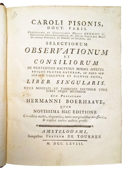 Caroli Pisonis […] Selectiorum observationum et consiliorum de praetervisis hactenus morbis affectionibusque praeter naturam, ab aqua seu serosa colluvie et diluvie ortis [.]. Cum praefatione Hermanni Boerhaave […].