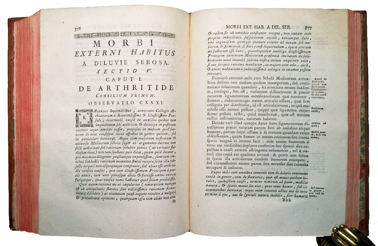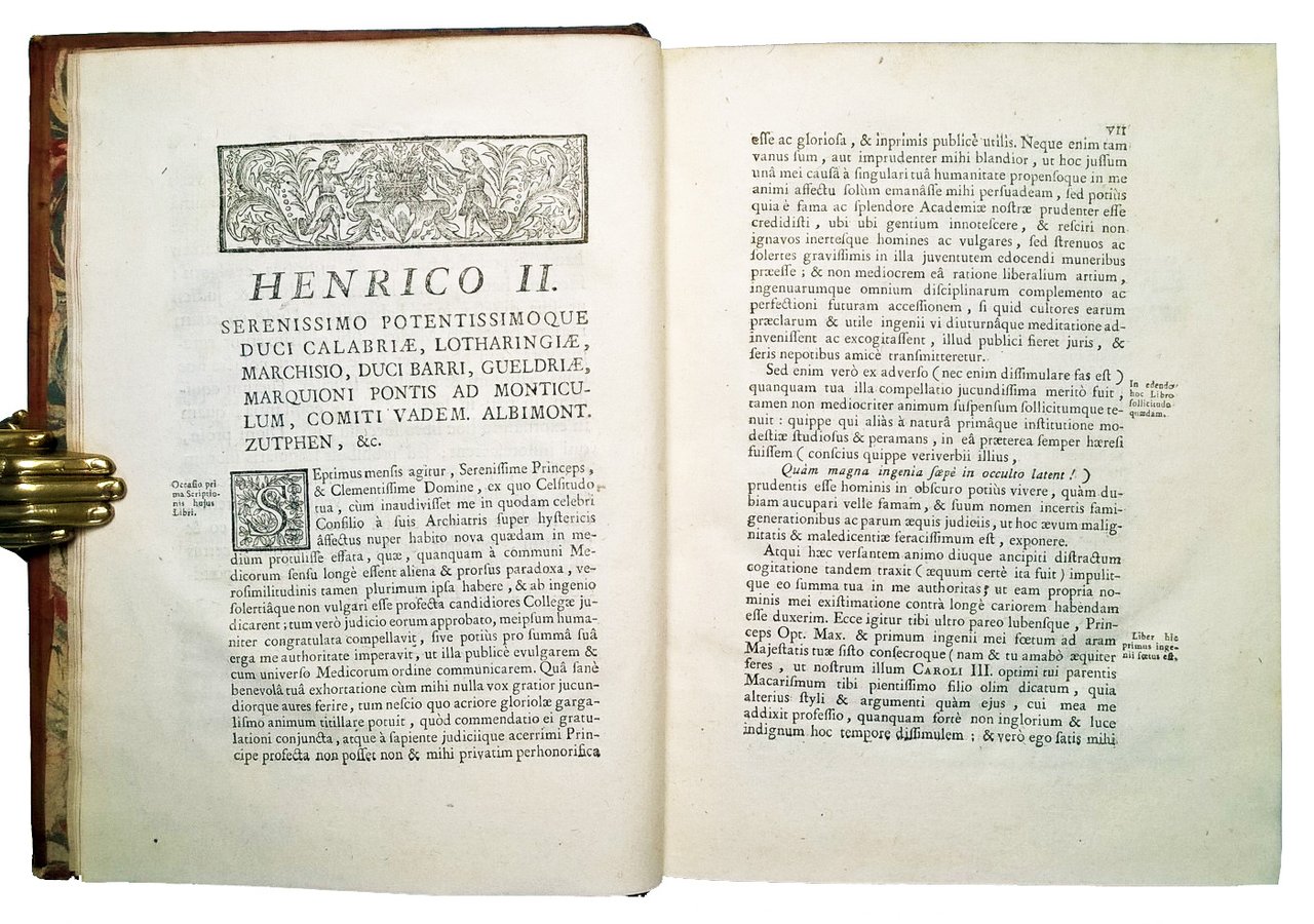 in-4°, 214x160 mm, leg. in piena pelle maculata con cinque nervi al dorso, titolo dorato su tassello in pelle rossa e decori dorati al dorso, carte marmorizzate alle guardie, tagli colorati di rosso; pp. XXXII, 496, [19], [1 b.]. Testatine e capilettera finemente decorati. Rara ultima edizione di questo trattato medico di Le Pois (la prima ed. era stata pubblicata nel 1618), con la prefazione a cura del Boerhaave. L'opera è suddivisa in due sezioni. La prima riguarda le lesioni neurologiche e della testa; la seconda, le malattie e i disturbi del petto. Prov.: Annotazione manoscritta all'ultima guardia libera, nella quale sono riportati alcuni dati editoriali dell'opera stessa. Rif.: IT\ICCU\TO0E\035979 (2 copie). OCLC, 4647747. Cond.: Lievi tracce d'uso alla legatura (abrasioni alle cuffie e ai margini dei piatti, in particolare all'angolo inf. del piatto ant.). Carte fresche e croccanti, in condizioni perfette. Nel complesso, copia quasi ottima. -- Rare last edition of this work published with Boerhaave's preface. The text is about evenly divided into two sections. The first deals with neurological and head injuries of all kinds. The second with diseases and ailments of the chest.