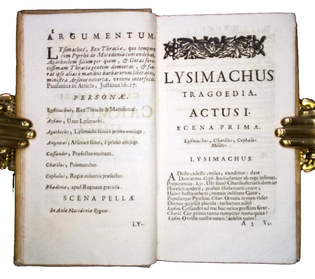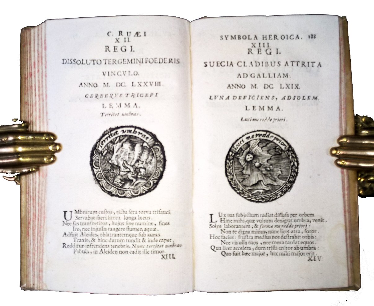 in-12° (146x82 mm), leg. coeva in piena pergamena, titolo manoscritto al dorso, tagli spruzzati di rosso; pp. 235, [1]; marca tipografica al frontespizio. Bella raccolta di poemi e panegirici scritti da Charles de La Rue (1643-1725), gesuita, scrittore di tragedie ed oratore. L'opera è suddivisa in quattro libri: liber I. Dramaticus; liber II. Panegyricus; liber III. Symbolicus; liber IV. Miscellaneus. Il terzo libro è illustrato con 26 medaglioni di Louis Cossin per Symbola heroïca, tutti finemente incisi su rame, rappresentativi di nobiltà e reali Francesi. Rif.: IT\ICCU\TO0E\026280. OCLC, 24033183. Cond.: Esemplare quasi ottimo, con la sua legatura originale intonsa.