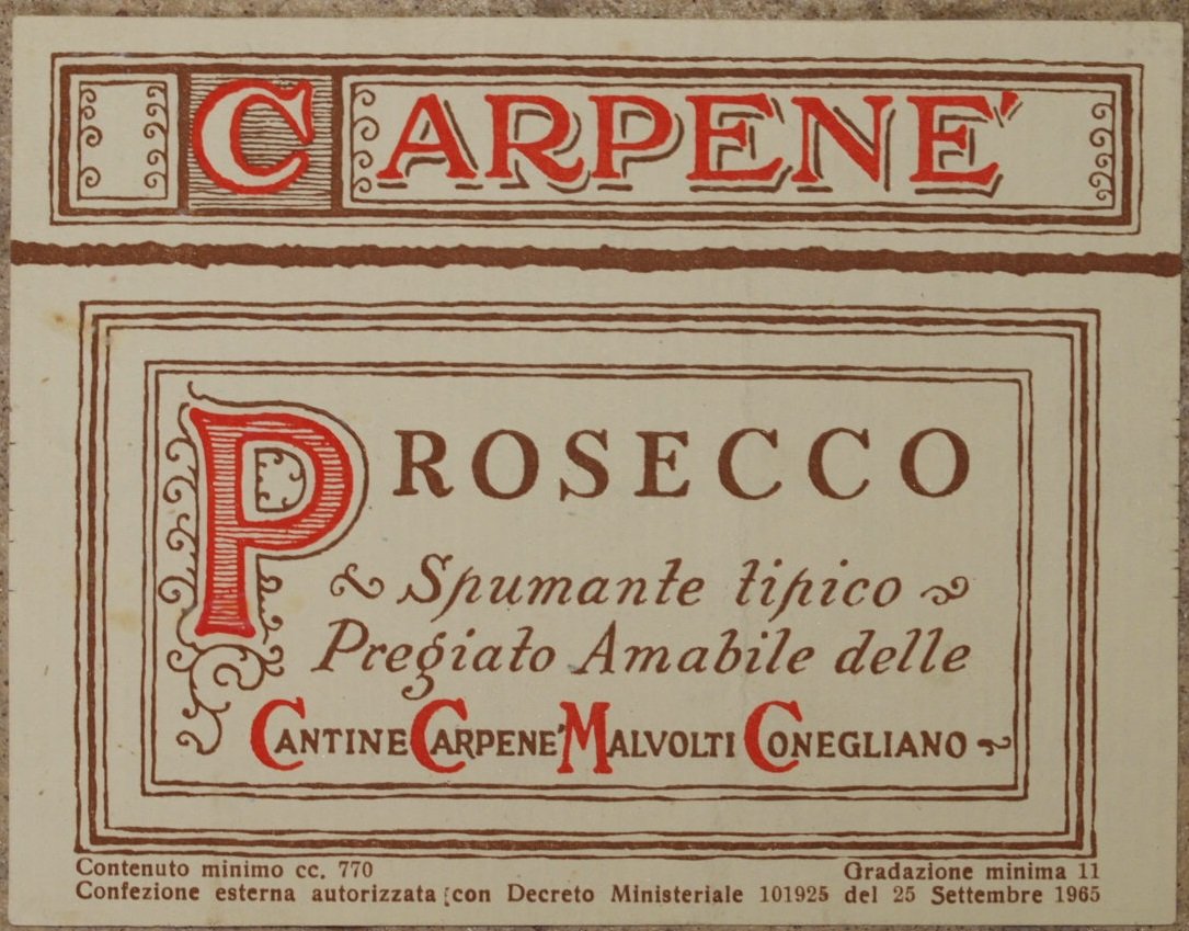 Bella etichetta del vino prosecco prodotto da Carpene di Conegliano. In ottime condizioni. Formato cm. 9x11,5. Beautiful label of prosecco wine produced by Carpene in Congeliano. In good conditions. Size cm. 9x11,5.