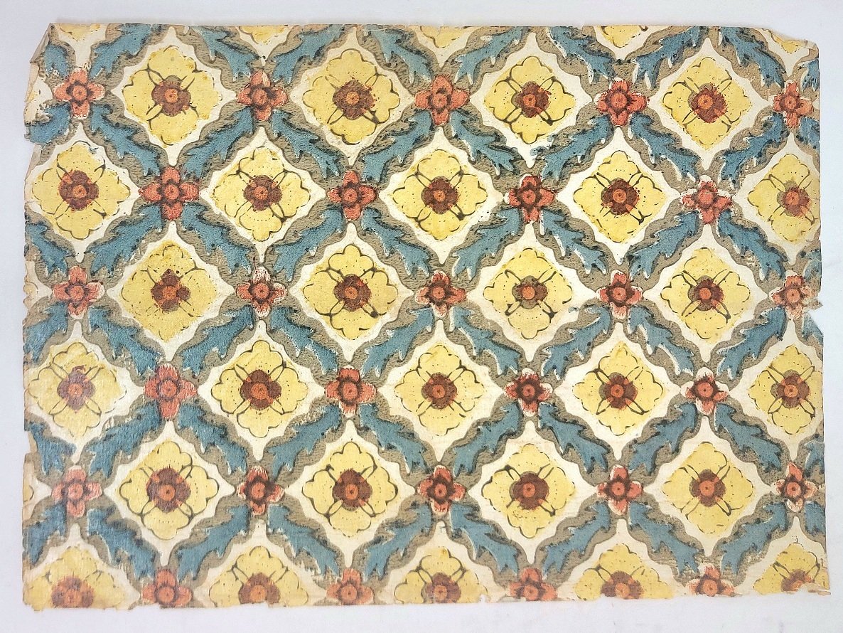 >Foglio (mm 270x195) di carta decorata e xilografata. Motivo: rombi blu che contengono fiori gialli e rossi, fiorellini rossi agli angoli dei rombi, fondo crema. Ben conservato.