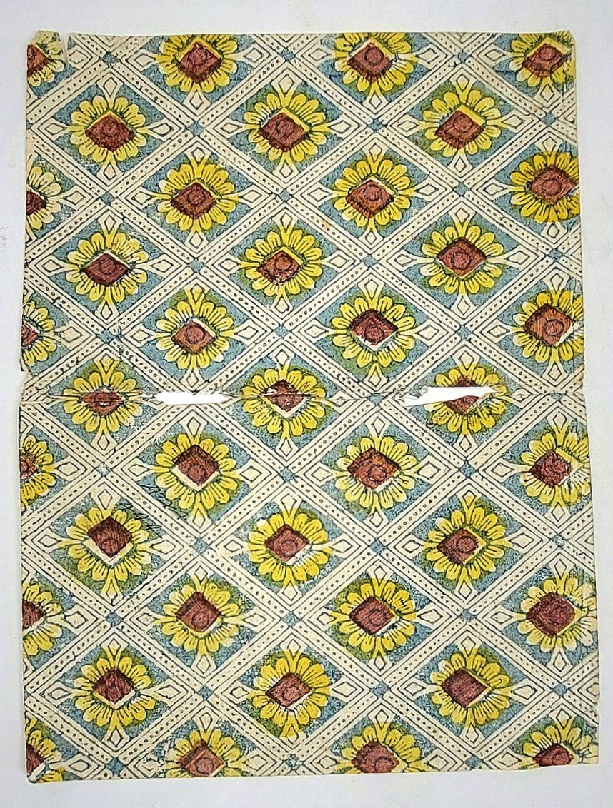 >Foglio (mm 280x210) di carta decorata e xilografata (carta domino). Motivo: Rombi con fiore centrale, giallo, marrone e azzurro. Discretamente conservato, traccia di antica piega centrale con due mancanze (ca 2 cm x 0,5) in prossimità della piega.