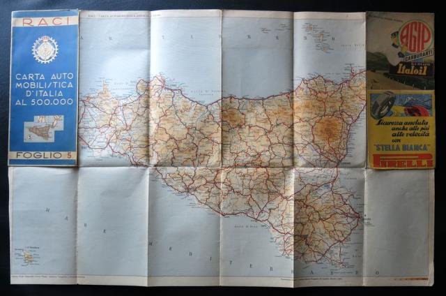 1939 circa. In 8vo lungo, carta ripiegata, copertina anteriore in azzurro e ill. pubblicitarie in colore alla copertina posteriore. Con la sigla RACI si indicava il Reale Automobile Club d'Italia, attivo dal 1927 al 1946 e in seguito rinominato ACI. Buono stato di conservazione.