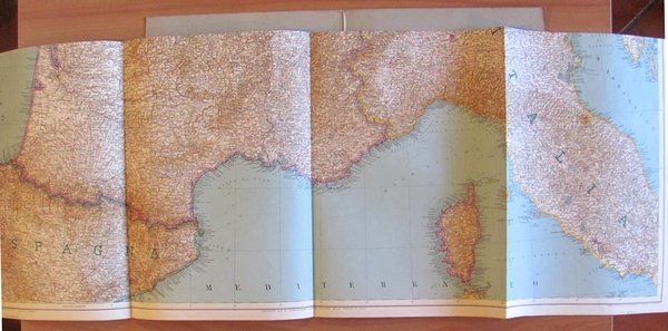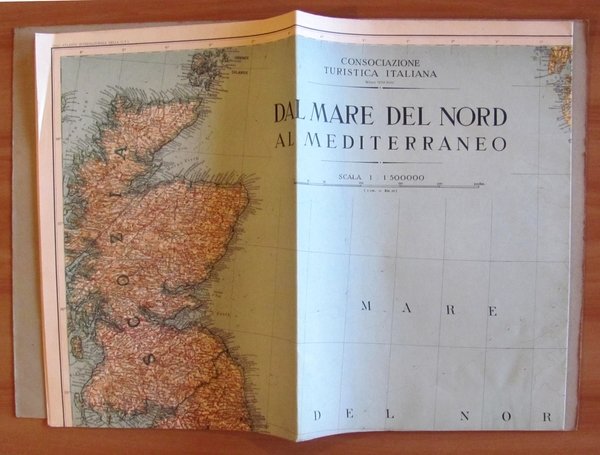 Carta in Scala 1: 1.500.000. Consociazione Turistica Italiana - Milano, 1939. Supplemento alla Rivista mensile "Le Vie d'Italia". Cartellina contenitrice della splendida cartina a colori più volte ripiegata. La sola cartellina presenta lievi segni del tempo. Chiusa 25x35 - Aperta 95x140. Rara e in Ottimo stato. ,