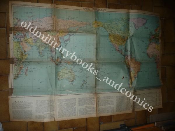 DESCRIZIONE: Carta degli Oceani del TCI datata 1941 i cui confini politici sono ovviamente quelli anteriori alla Seconda Guerra Mondiale. Dimensioni 116x82 cm. CONDIZIONI DELL'OGGETTO: Accettabili carta con rotture e scocth da pacco presente al retro in tutte le piegature, potete comunque vedere in foto. PESO/WEIGHT: 139 g without package