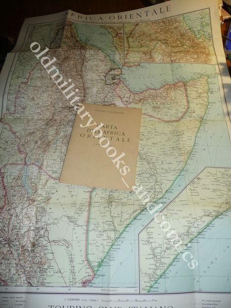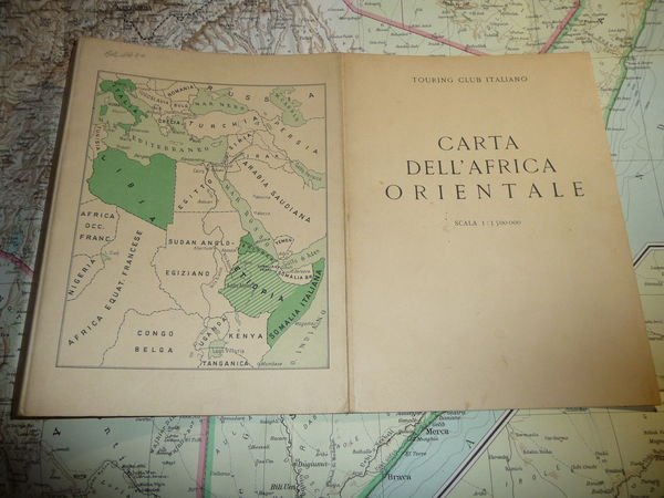 DESCRIZIONE: Carta dell'Africa Orientale riproducente Eritrea, Etiopia (Abissinia), Somalia dimensioni 60x82 cm. Il contenitore all'interno contiene una breve descrizione geografico, socio economica dei territori riprodotti. Carta data come supplemento a Le Vie d'Italia n. 10 del 1935. CONDIZIONI DELL'OGGETTO: Perfette sia la carta, allo stato di nuovo, che il contenitore. PESO/WEIGHT: 70 g without package