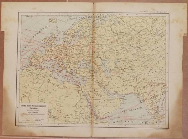 Bella litografia del 1893 tratta dall'opera "Nuovo atlante geografico disegnato sotto la direzione di Luigi Hugues da G. E. Frietzsche". L'incisione rappresenta la carta delle comunicazioni europee. INCISIONE: Litografia INCISORE: DIMENSIONI FOGLIO: cm 36,5x26,5 DIMENSIONI INCISIONE: cm 30x22, EPOCA: 1893 CONDIZIONI: Buone condizioni, fioriture e bruniture. Piegatura verticale. Piccolo strappo. Antiche note manoscritte.Very beautiful lythography of 1893 taken from the geographical work "Nuovo atlante geografico disegnato sotto la direzione di Luigi Hugues da G. E. Frietzsche". View of Physical Europe. ENGRAVING: Lythography ENGRAVER: LEAF DIMENSION: 36,5x26,5 ENGRAVING DIMENSION: cm 30x22,5 DATE: 1893 CONDITIONS: Good conditions. Foxings and yellowings. Little tear. Vertical folding. Ancient manuscripted notes.