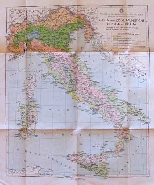 9^ Compartimento Venatorio (Lazio e Umbria) al retro Carta delle Zone Faunistiche del Regno d'Italia. Istituto geografico De Agostini - Novara, s.d. anni '30. Splendida cartina a colori più volte ripiegata con piccolo taglio a una delle piegature. Chiusa 12x18 - Aperta 90x90. Rara, Buonissimo stato. ,