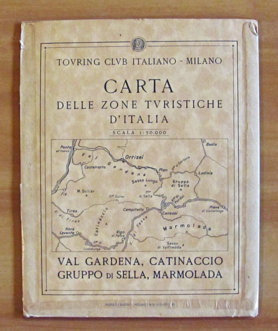Carta delle Zone Turistiche d'Italia. Scala 1: 50.000. Val Gardena, Catinaccio, Gruppo di Sella, Marmolada. Ufficio Cartografico del T.C.I. - Milano, 1930. Custodia originale con splendida cartina a colori più volte ripiegata n.t. e libretto con Indice dei nomi. Chiusa 16,5x20 - Aperta 79x54. OTTIMO STATO , Ottimo (Fine)