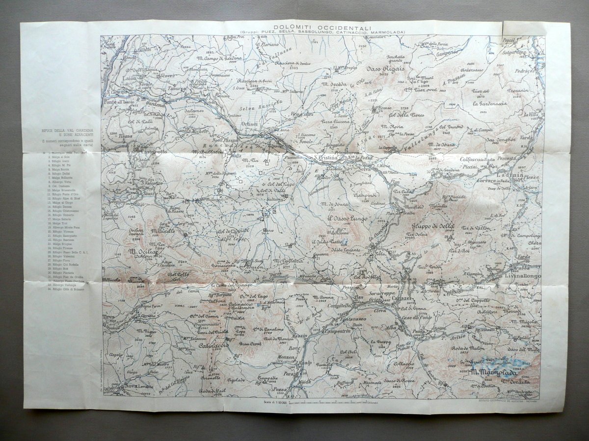 Carta, Dolomiti Occidentali (Gruppi: Puez, Sella, Sassolungo, Catinaccio, Marmolada) Rifugi della Val Gardena e zone adiacenti - Carta topografica a colori Scala 1:50000 De Agostini, Novara, s. d. (anni '30 del Novecento circa); carta topografica a colori rip. più volte; legenda a un margine est. Cm 50x70. Retro con un'annotazione a pastello blu. Condizioni di conservazione Esemplare in buone condizioni con tracce d'uso, margini con pochi piccoli strappetti, tutti in corrispondenza delle estremità delle pieghe (al margine sup. sono presenti due strappetti di qualche cm, vedi foto). SC03.D11834 N