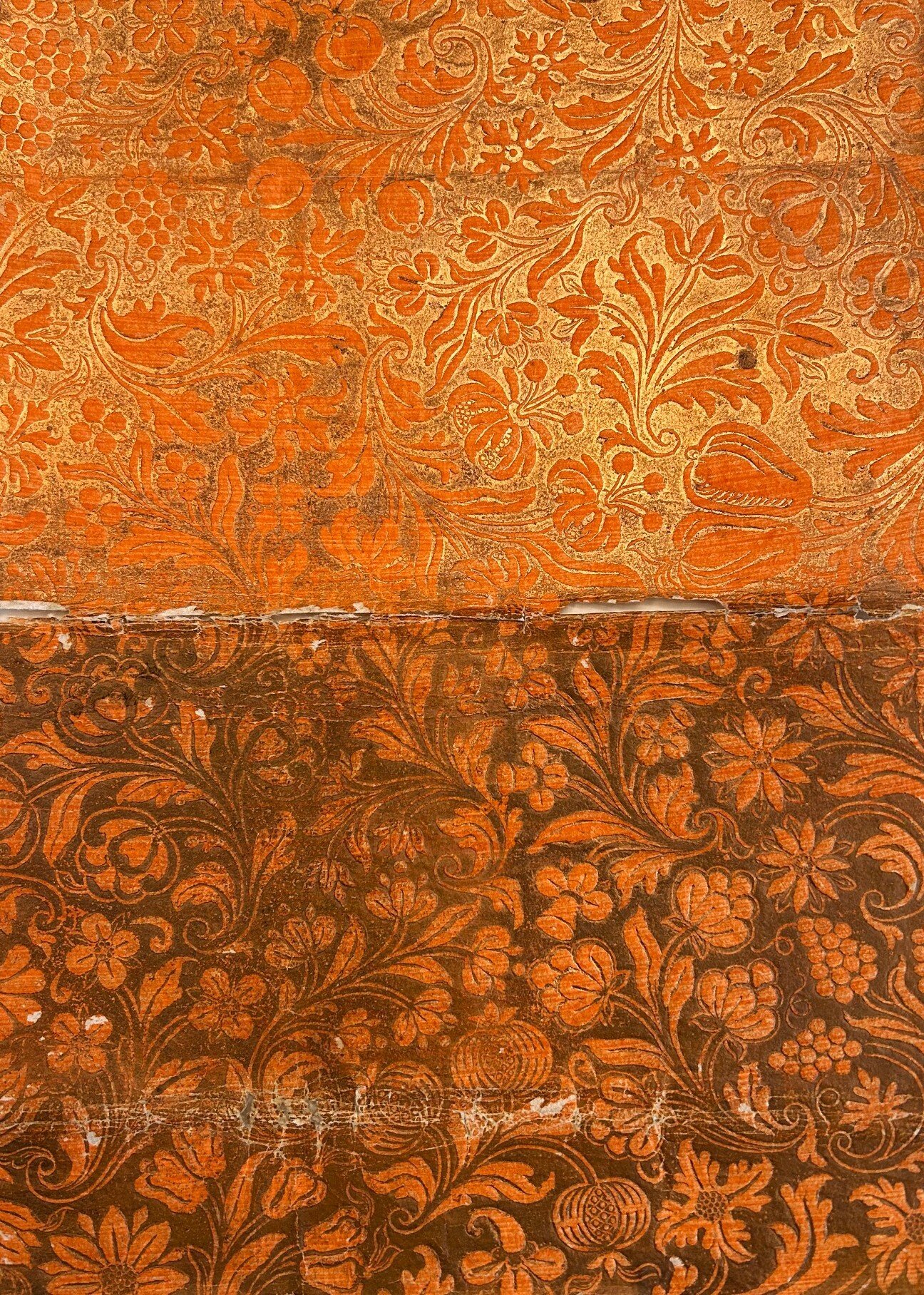 >1 foglio (300x214 mm) di carta dorata e goffrata con colorazione arancione a pennello. Fiorami e grappoli d'uva e melograni entro fogliami su steli mossi. Rifilato, pertanto non visibile la firma. Proveniente da area tedesca, probabilmente Augsburg. Tracce di antiche piegature, mancanze nella parte centrale.