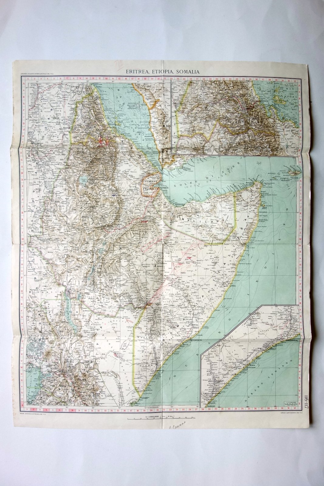 Carta geografica, Eritrea - Etiopia - Somalia scala 1:5.000.000 TCI, s. d. ma fine anni '30 del '900; carta geografica a colori; dettaglio dei dintorni di Mogadiscio all'angolo inf. destro. Al retro alcune note descrittive e bibliografiche a stampa. Cm 57,5x46. Condizioni di conservazione Esemplare in buone condizioni con tracce d'uso, pieghe di conservazione, qualche annotazione / segno a pastello rosso (vedi foto). SC03.D17363 N