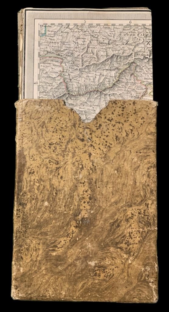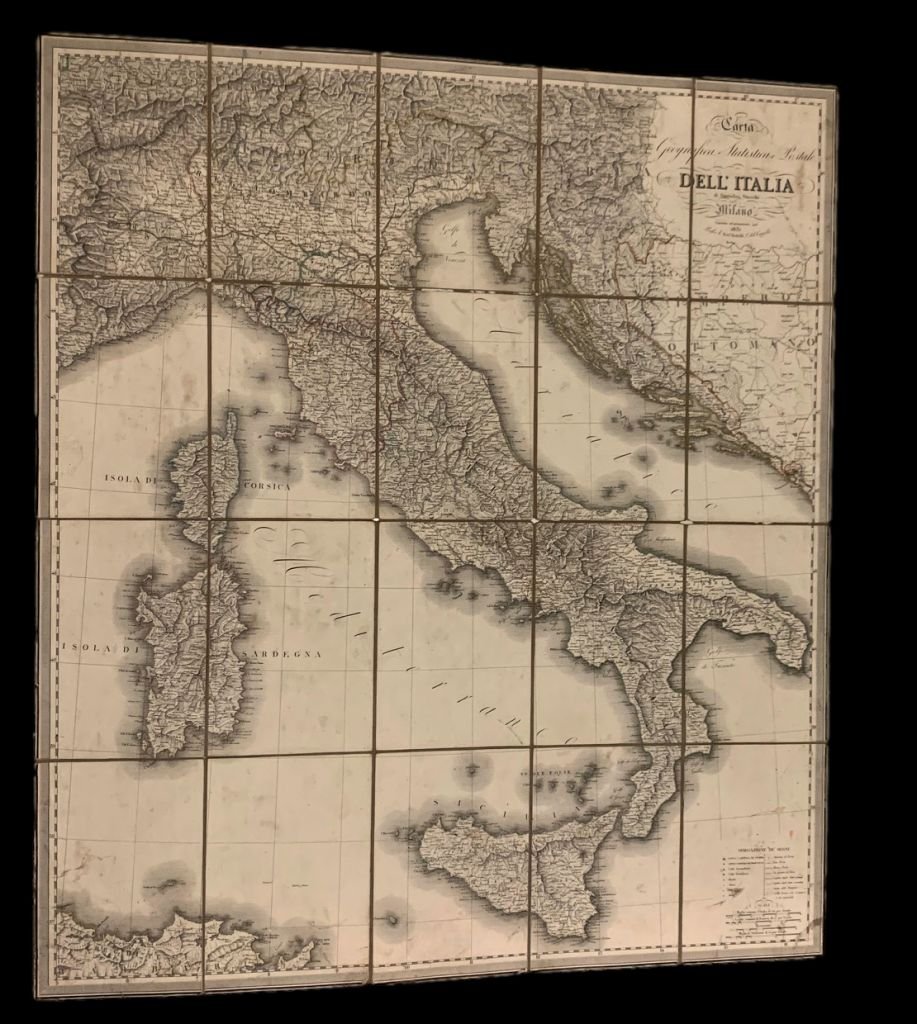 90x77 cm; Grande carta più volte ripiegata, applicata su tela e conservata entro custodia in cartoncino foderata con bella carta in cartoncino coevo. La carta presenta i confini delle varie zone, ripresi a colori. Prima edizione di questa carta d'Italia riveduta e corretta rispetto alle precedenti versioni, stampata a Milano dai Fratelli Bettelli e realizzata dal noto cartografo ed incisore nato nel 1780 ed attivo a Milano fino alla prima metà del XIX° secolo, Stanislao Stucchi. La carta si presenta in buone-ottime condizioni di conservazione e completa della sua custodia in cartoncino foderato, coevo. Rif. Bibl.: Archivio di Stato di Torino, A.38 P.1 n.63.