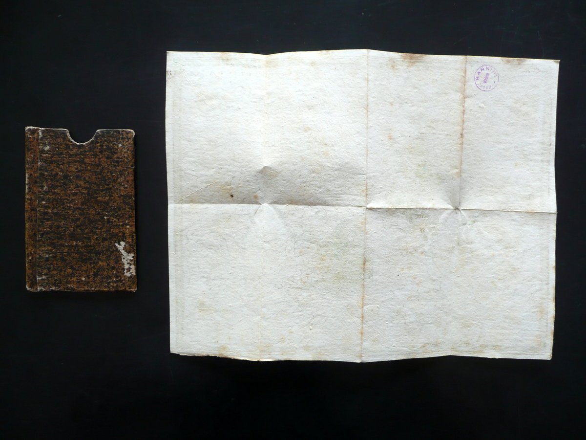 Antica carta incisa in bianco e nero, con dettagli a colori; Imperium Romano - Germanicum in suos circulos et elector et status divisum apud Matth. Seutter S. d. (fine '700 circa); carta d'epoca incisa in b/n su carta, ripiegata pi√π volte; dettagli e confini degli stati a colori; legenda a un angolo inf. Carta inserita entro custodia in cartonato marmorizzato, con frontespizio originale applicato a un piatto. Retro della carta con timbretto ex - libris del precedente collezionista. Condizioni di conservazione Carta ben conservata con tracce d'uso, piccole lievi / leggere bruniture. Custodia ben conservata con alcune piccole / minime abrasioni ai margini e agli angoli. SC03.D15144 N
