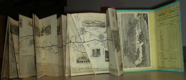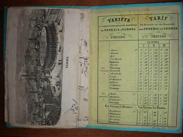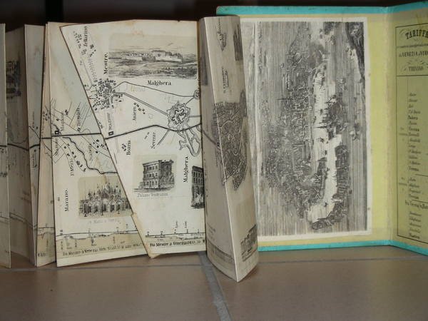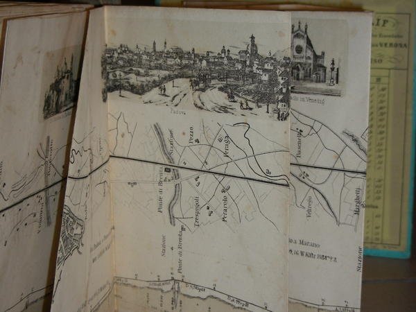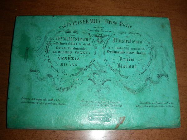 album a leporello in-16 (mm. 188x138), leg. cartone edit. verde con cop. con tit. e fregi. Testo italiano e tedesco. Rara descrizione del tratto ferroviario da Verona a Venezia, contenente una lunga carta topogr. per un’estensione totale di cm. 378, con gr. vedute prospettiche di Verona e Venezia intervallate da vedute di città e paesi attraversati: S. Giacomo, Soave, Montebello, Valmarana, Vicenza (3), Altavilla, Casa Carcano, Padova (5), Marghera, Venezia (9). Belliss. esempl. Raro. [346]