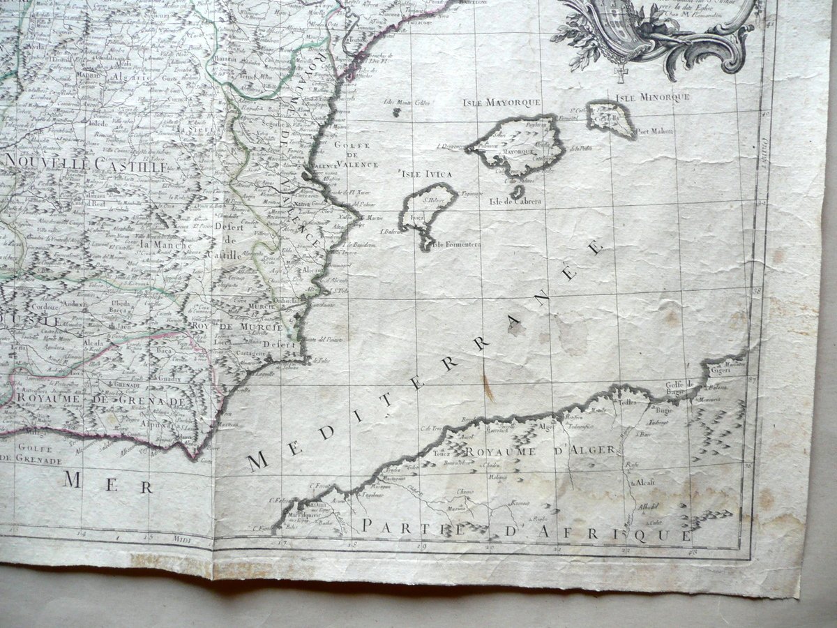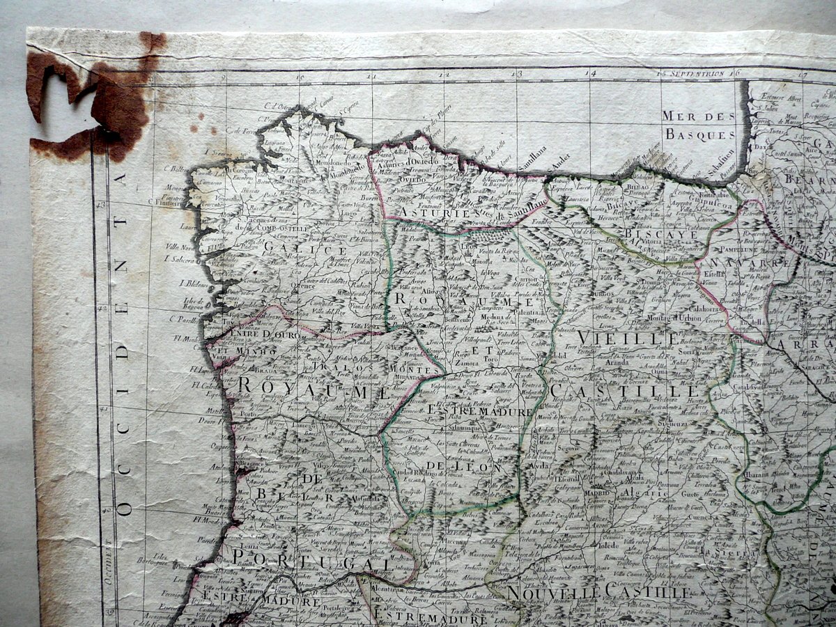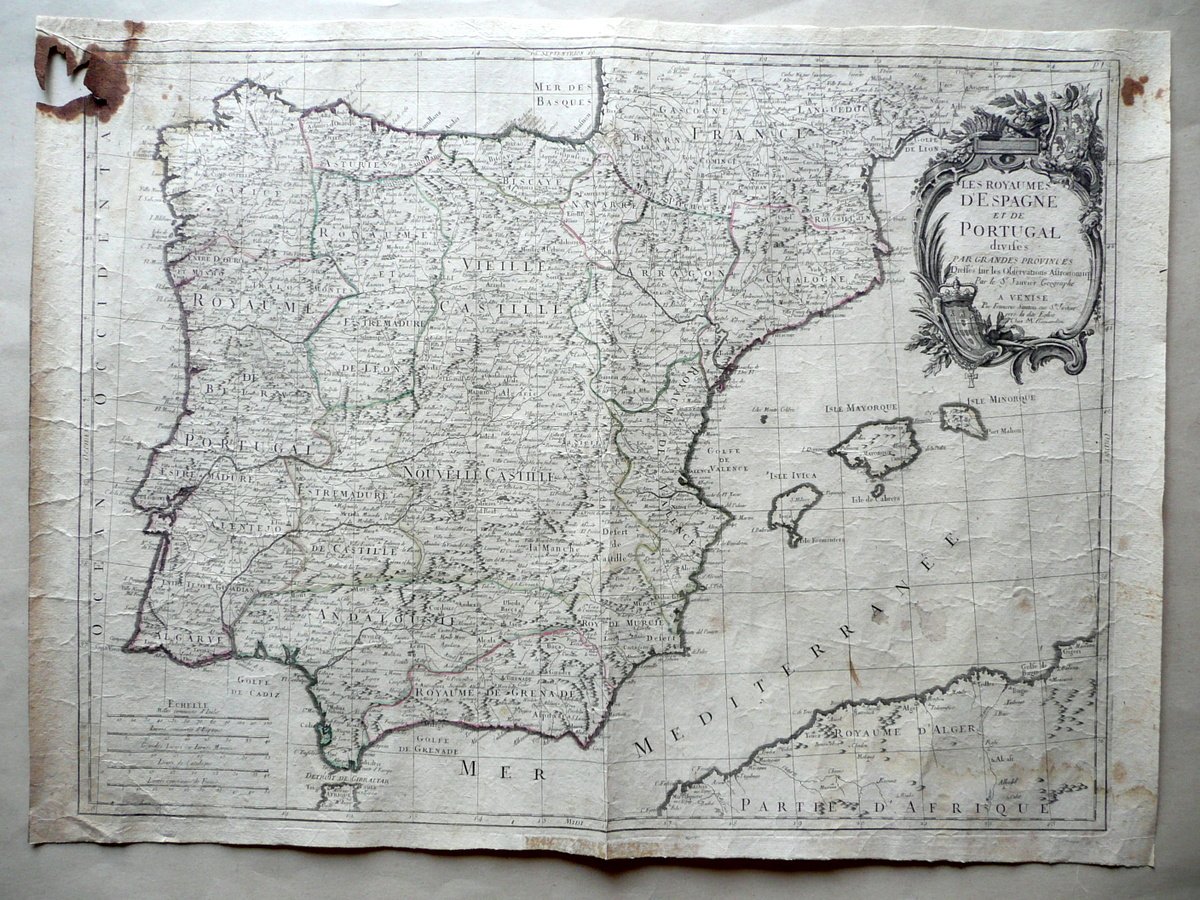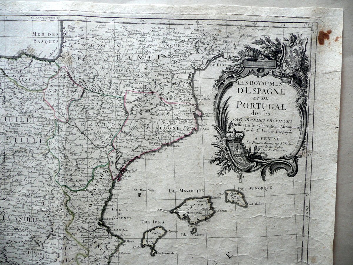 Carta geografica d'epoca, Les Royaumes d'Espagne et de Portugal Divisés par grandes provinces Dressés sur les observations astronomiques Par les Sr. Janvier Geographe Par François Santini - Chez Remonidini, Venise, s. d. (ma 1776-84); grande bella carta geografica d'epoca incisa in b/n su carta, con dettagli a colori (colorazione d'epoca a mano, vedi foto). Cm 50x68,5. Condizioni di conservazione Esemplare complessivamente ben conservato con tracce d'uso e del tempo; normale leggera traccia di piega longitudinale; alcune minime bruniture e accenni di sporco; qualche piccolo lieve alone; margine inf. con minuscole irregolarità e una circoscritta leggerissima ombra di gora che non compromette l'illustrazione (vedi foto); un angolo sup. con qualche strappetto, una piccola mancanza e una macchietta che interessa marginalmente la carta (vedi foto). Edizione veneziana della Carta della Penisola Iberica realizzata dal Janvier; proveniente dall' Atlas Universal". EXTRAR0006 S01 "