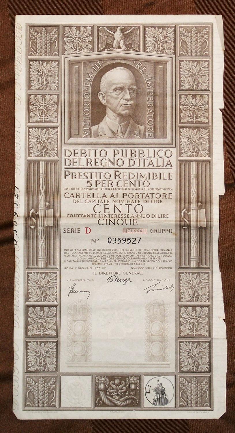 >Cedola di cm. 35,3x18,5, ritratto di Vittorio Emanuele III entro bordura incisa. Cartella al portatore del capitale nominale di lire cento fruttante l'interese annuo di lire cinque (alla scadenza, oltre agli interessi, veniva restituito il capitale, emesso per finanziare la guerra d'Etiopia (R.D.L. 5 ottobre 1936 - XIV).