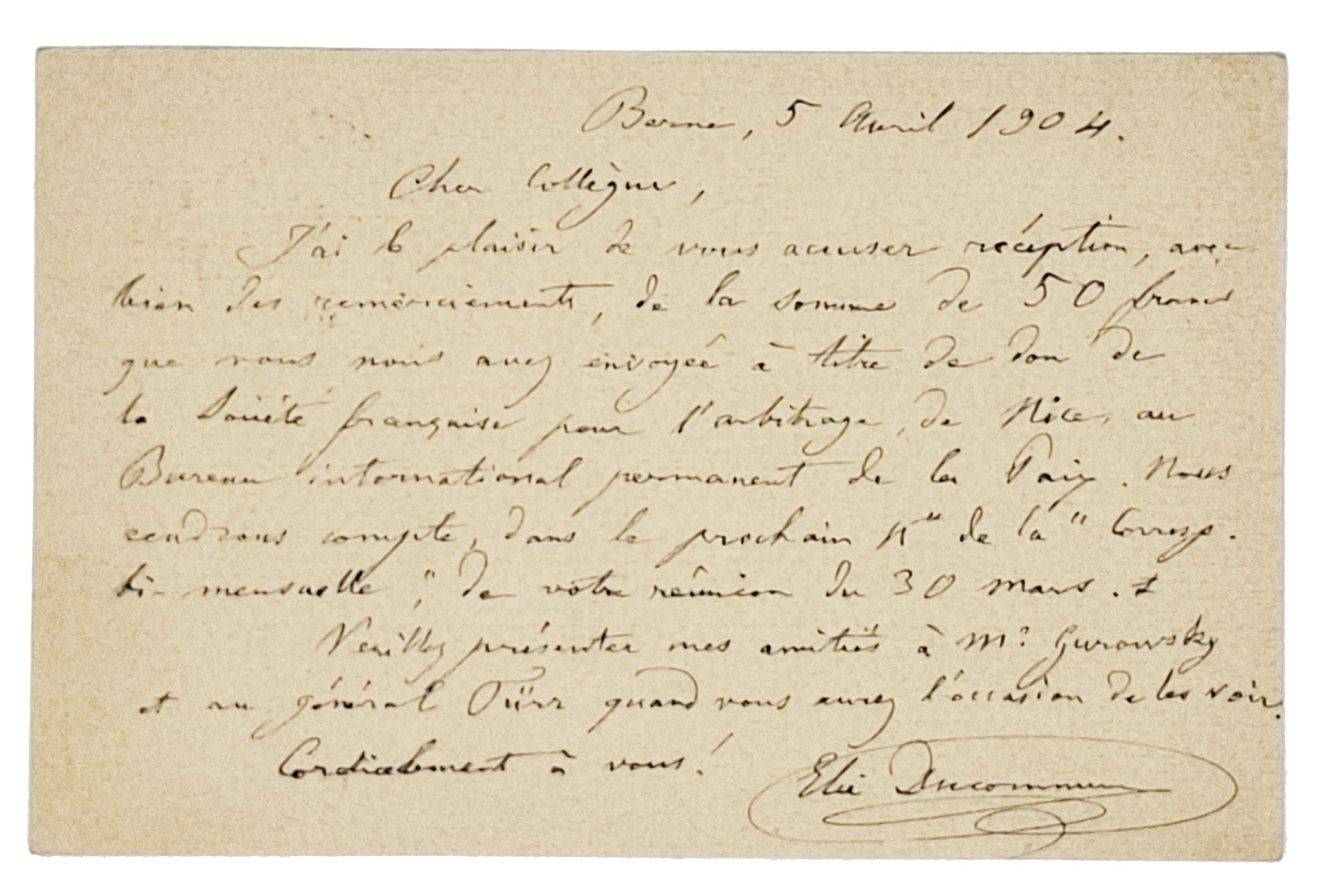 Lettera manoscritta, datata 'Berne, 5 avril 1904', su carta postale, con autografo originale, a penna, di Elie Ducommun (1833-1906), giornalista e politico svizzero, Premio Nobel per la Pace nel 1902. Da Wikipedia: 'Assieme a Giuseppe Garibaldi, Ducommun,concretizza prima l'organizzazione del Congresso della Pace che si terrà a Ginevra nel 1867 per passare, poi, alla fondazione della Lega della Pace e della Libertà.L'impiego pacifista assorbe da allora una parte sempre crescente del suo tempo ed è grazie a lui che nasce l'Ufficio Internazionale della Pace, che diventa un centro di informazioni e di incontri perenne su tale tematica e gli permette di ottenere nel 1902 il Premio Nobel per la Pace'. Testo della lettera in lingua francese. Decisamente ben conservata. Formato della carta postale: 14 x 9 cm circa.