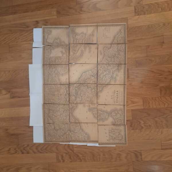 Carta geografica a colori divisa in 18 parti incollate su tela. Cm. 77 x 58.