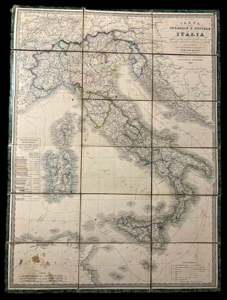 78x58 cm; 18 spicchi applicati su tela coeva con cornice realizzata con carta marmorizzata coeva verde. Qualche macchiolina del tutto ininfluente, una leggerissima macchia di unto nella zona africana dell'ultimo spicchio in basso a sinistra), due piccolissimi forellini di puntina ai due angoli alti della carta, fuori dalgli spicchi, sul margine in carta marmorizzata, ininfluenti e nel complesso esemplare in buone-ottime condizioni di conservazione. Prima edizione in questo formato, una seconda uscirà nel 1843, di questa nota carta stradale e postale dell'Italia, in fini coloritura coeva, realizzata dal noto geografo e statista veneziano, Adriano Balbi. Figlio di un governatore dell'isola di Veglia, Adriano Balbi esordì a Venezia con il testo "Prospetto politico-geografico dello stato attuale del mondo". La pubblicazione di questo lavoro nel 1808 gli valse subito la cattedra di Geografia presso il Collegio di S. Michele a Murano e, dal 1811 al 1813, l'insegnamento della fisica al Liceo di Fermo. Tornato a Venezia, lavorò come funzionario della Dogana. Nel 1820 visitò il Portogallo, dove raccolse diverso materiale per un "Saggio di statistica sul Regno del Portogallo e dell'Algarve" e per il testo "Varietà politiche e statistiche della monarchia portoghese" (pubblicato a Parigi nel 1822), che contiene alcune interessanti osservazioni sulla regione lusitana ai tempi della dominazione Romana. Nel 1821 si trasferì a Parigi, dove si trattenne sino al 1832 e dove pubblicò, in francese, i lavori che da tempo andava preparando. Fra di essi spicca l' "Atlante etnografico del mondo" , in folio, opera di grande erudizione, dove le popolazioni vengono classificate a seconda della lingua. Ma il libro che gli diede fama internazionale fu il "Compendio di Geografia". Quest'opera si fece notare per la novità dell'impostazione, nonché per l'abbondanza e l'esattezza delle informazioni, e divenne ben presto un classico, tanto che fu tradotta, in una forma ampliata, nelle principali lingue d'Europa e, in seguito, riedita da Henry Chatard nel 1872. In essa Balbi fonda lo studio della Geografia sui bacini idrografici. La diffusione e l'importanza di quest'opera fecero sì che egli fosse chiamato a Vienna dal Governo austriaco con il titolo di Consigliere per la Geografia e la Statistica. Dopo l'esperienza austriaca tornò in Italia, prima a Milano, poi a Venezia, dove morì nel 1848. Non comune e ancor meno comune in quest'edizione del 1841.