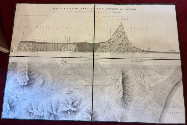 Carta topografica del bacino del Fucino (e) Pianta e sezione verticale dell’Emissario di Claudio dal suo fondo fino alla superficie del terreno
