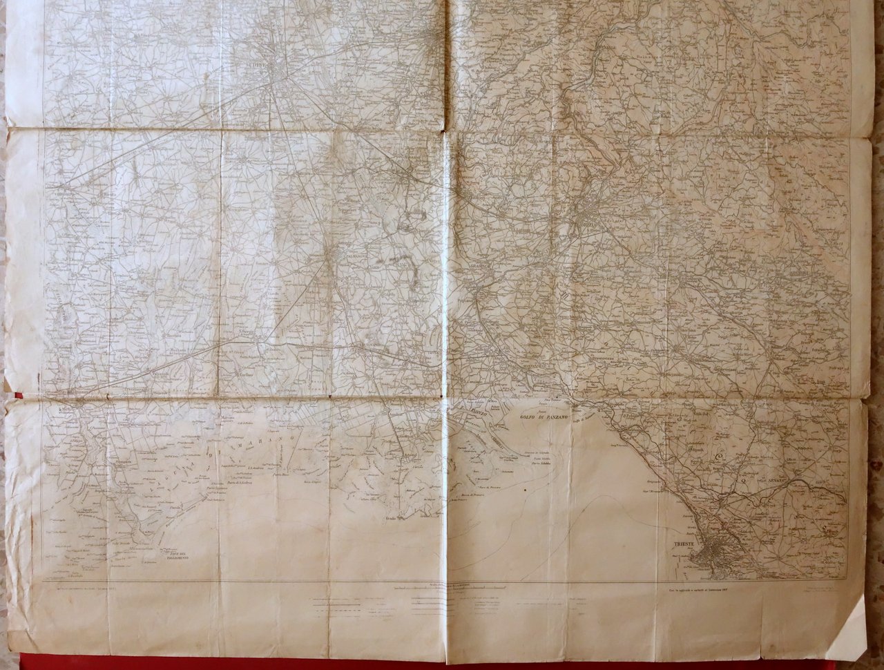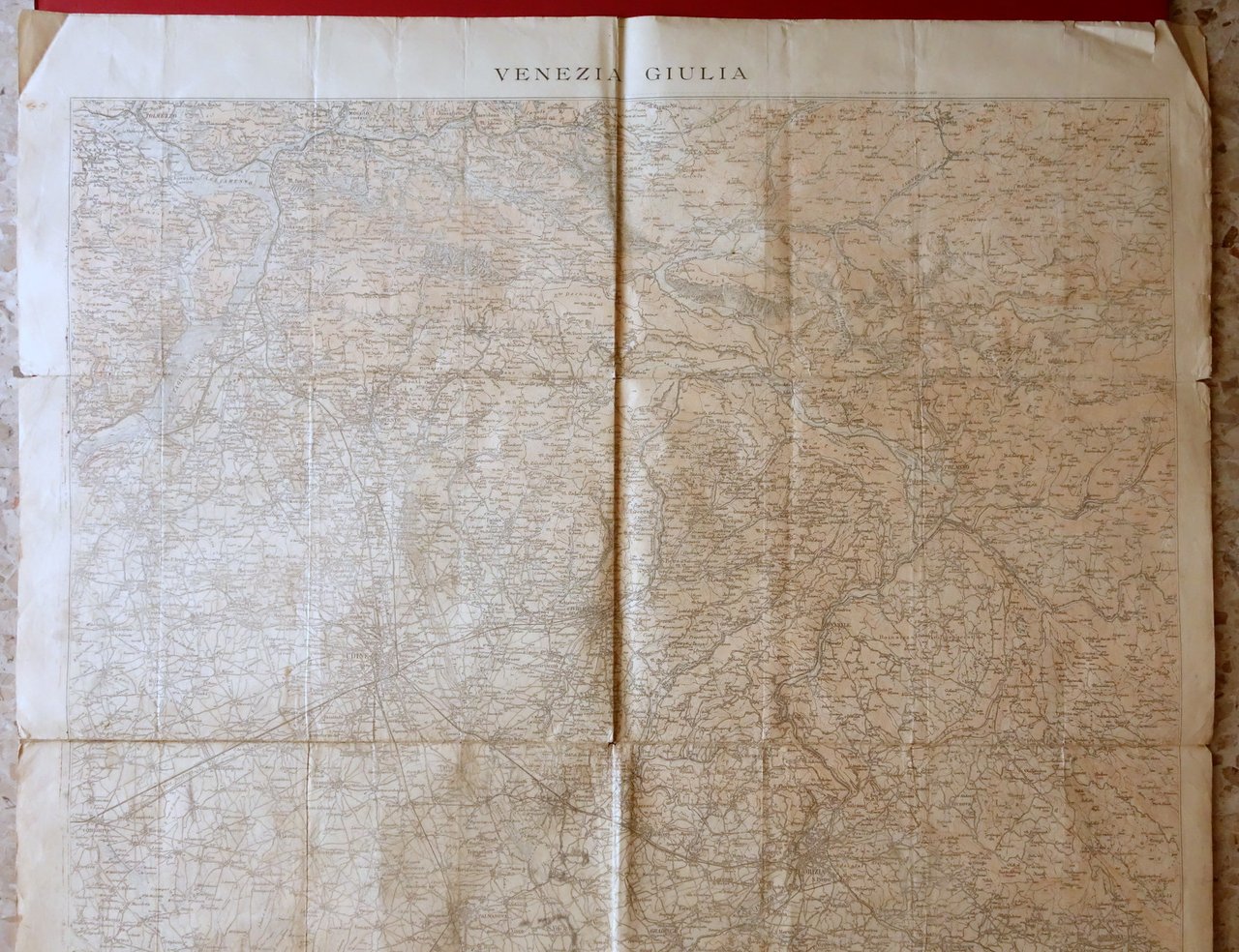 Grande carta topografica a colori, Venezia Giulia scala 1:100.000 con le aggiunte e varianti al settembre 1917 IGM, 1917; grande carta topografica con dettagli a colori, ripiegata più volte; legenda al margine inferiore; retro bianco. Cm 101,5x83. Condizioni di conservazione Condizioni complessivamente buone con tracce d'uso, alcune minime lievi bruniture e pressoché trascurabili accenni di sporco; margini e angoli leggermente sgualciti, con qualche piccolo / minimo strappetto e tracce di pieghette. SC03.D18509 N F
