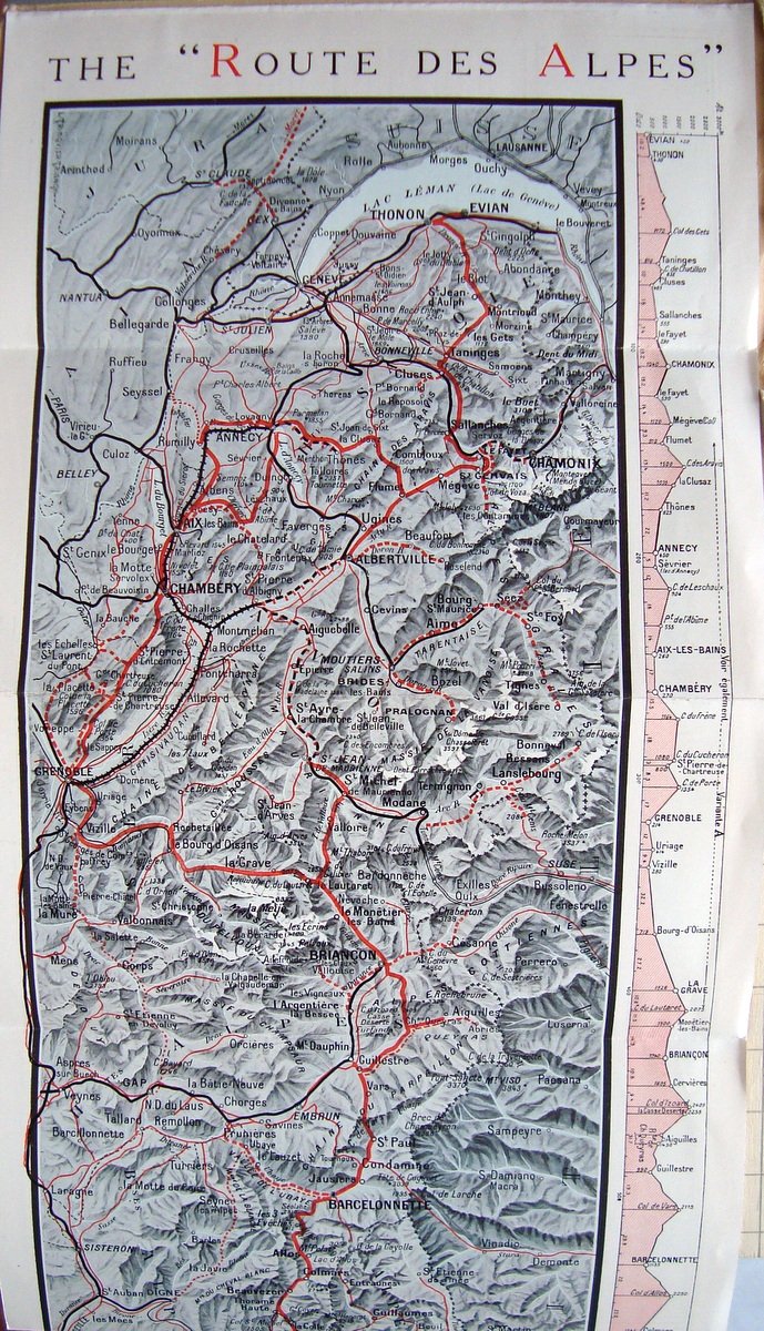 Carta Topografica, THE ROUTE DES ALPES EVIAN THONON NICE J.Barreau Paris, s.d. primi '900,(chiuso) 24,50 x 12 cm., pieghevole a fisarmonica, ill.fotografiche b.n Condizioni di conservazione. buono stato con leggere tracce d'uso e del tempo, brossura ant e post in cartoncino con piccole macchiette OPEB.2737 BLU
