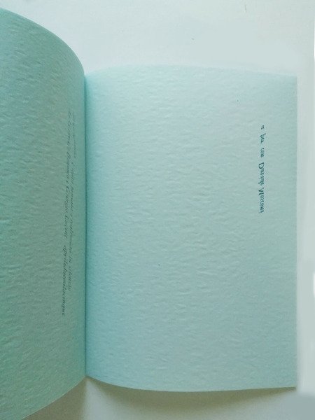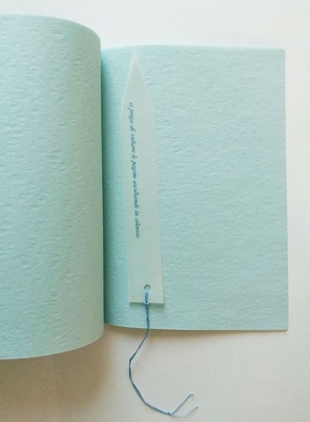 Plaquette in carta Onion Skin. Formato 17X12,7. Legatura con filo. Segnalibro SI PREGA DI VOLTARE LE PAGINE ASCOLTANDO IL SILENZIO. Copia dedicata tipograficamente a Davide Mosconi. Bella copia