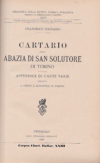 In-8°, pp. XXVIII, 384, (2) di errata corrige, legatura posteriore m. tela con titolo in oro al dorso. Brossura conservata. Ottimo stato. Prima edizione, pubblicata sotto il patronato del Municipio di Torino. Le pp. in nn. romani contengono l'introduzione del Cognasso, quelle in numeri arabi il cartario inedito dell'abbazia. 'Index locorum et personarum' alle pp. 323 e sgg. Biblioteca della Società Storica Subalpina diretta da Ferdinando Gabotto, XLIV. Corpus Chart. Italiae, XXXII.